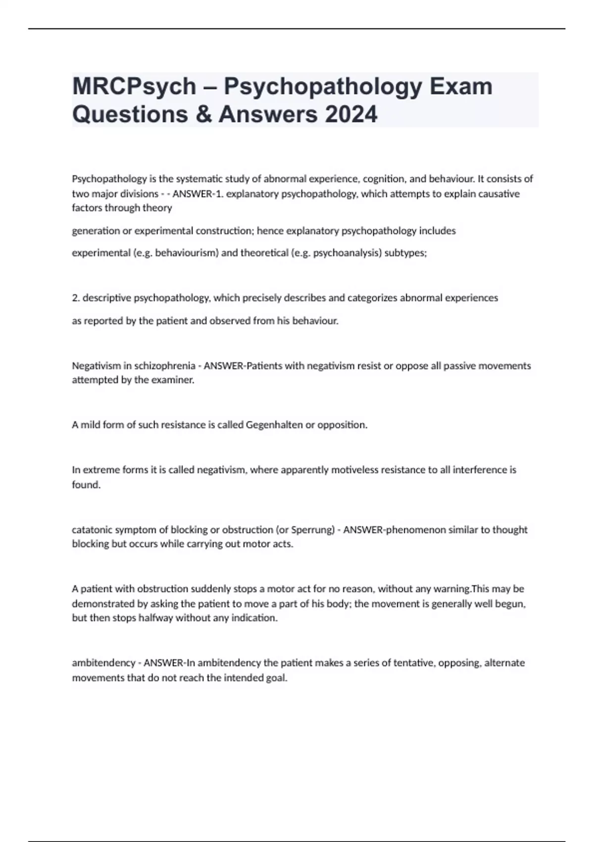 MRCPsych – Psychopathology Exam Questions & Answers 2024 Psychopathology is the systematic study of abnormal experience, cognition, and behaviour. It consists of two major divisions - - ANSWER-1. explanatory psychopathology, which attempts to explain causative factors through theory generation or experimental construction; hence explanatory psychopathology includes experimental (e.g. behaviourism) and theoretical (e.g. psychoanalysis) subtypes; 2. descriptive psychopathology, which precisely describes and categorizes abnormal experiences as reported by the patient and observed from his behaviour. Negativism in schizophrenia - ANSWER-Patients with negativism resist or oppose all passive movements attempted by the examiner. A mild form of such resistance is called Gegenhalten or opposition. In extreme forms it is called negativism, where apparently motiveless resistance to all interference is found. catatonic symptom of blocking or obstruction (or Sperrung) - ANSWER-phenomenon similar to thought blocking but occurs while carrying out motor acts. A patient with obstruction suddenly stops a motor act for no reason, without any warning.This may be demonstrated by asking the patient to move a part of his body; the movement is generally well begun, but then stops halfway without any indication. ambitendency - ANSWER-In ambitendency the patient makes a series of tentative, opposing, alternate movements that do not reach the intended goal.
