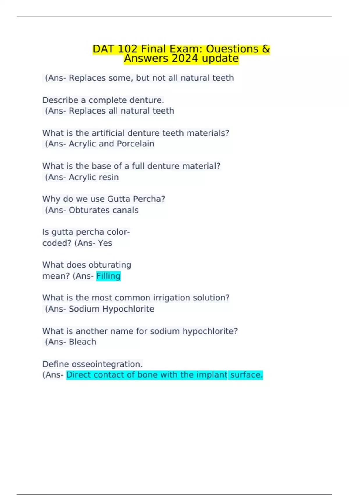DAT 102 Final Exam: Questions & Answers 2024 update DAT 102 Final Exam: Questions & Answers 2024 update (Ans- Replaces some, but not all natural teeth Describe a complete denture. (Ans- Replaces all natural teeth What is the artificial denture teeth materials? (Ans- Acrylic and Porcelain What is the base of a full denture material? (Ans- Acrylic resin Why do we use Gutta Percha? (Ans- Obturates canals Is gutta percha color-coded? (Ans- Yes What does obturating mean? (Ans- Filling What is the most common irrigation solution? (Ans- Sodium Hypochlorite What is another name for sodium hypochlorite? (Ans- Bleach Define osseointegration. (Ans- Direct contact of bone with the implant surface. Candidates for dental implants. (Ans- Gums/teeth are in good health. Good bone density. Good teeth habits What is the material most often used as implants? (Ans- Titanium What are implants placed IN bone called? (Ans- Endosteal What is the most common type of dental implant? (Ans- Endosteal What is syneresis? (Ans- Shrinkage What is Galvanism? (Ans- Small electric shocks created when 2 different metals are present What does microleakage mean? (Ans- When saliva and food debris seep between the tooth at the margins Can cause recurrent decay and/or tooth sensitivity Define thermal expansion. (Ans- Ability of a material to expand and contract when temperature changes Explain Gel (Ans- Semi-solid Explain Sol (Ans- Semi-liquid What is Imbibition? (Ans- Inlarge (Enlarge) Microleakage is caused by ? (Ans- Thermal expansion What is alginate? (Ans- Irreversible hydrocolloid What is agar? (Ans- Reversible hydrocolloid What is the elastomeric material with the best dimensional stability? (Ans- Polyvinyl Siloxane What is another name for polysulfide? (Ans- "Rubber base" Explain condensation silicone. (Ans- High dimensional Instability Explain Polyether. (Ans- Hydrophilic, setting time:4-6 min, can be poured up to 1 week What is evidence based dentistry? (Ans- We don't do something in dentistry without evidence to back it up What are some advantages/disadvantages of irreversible hydrocolloids? (Ans- Advantage: economical, rapid setting, patient comfort Disadvantage: loss of accuracy, imbibition, syneresis What are some advantages/disadvantages of reversible hydrocolloid? (Ans- Advantage: better accuracy, more economical Disadvantage: additional equipment, prep time is more How does the water temperature affect alginate? (Ans- Warm water-shortens setting time