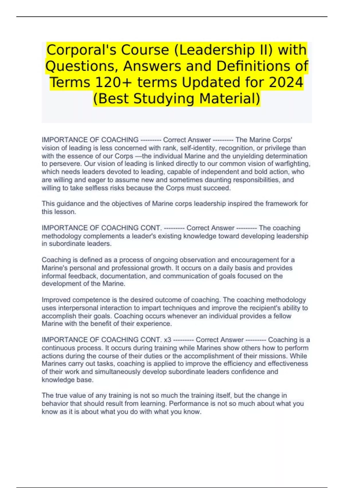 Corporal's Course (Leadership II) with Questions, Answers and Definitions of Terms 120+ terms Updated for 2024 (Best Studying Material) Corporal's Course (Leadership II) with Questions, Answers and Definitions of Terms 120+ terms Updated for 2024 (Best Studying Material) IMPORTANCE OF COACHING --------- Correct Answer --------- The Marine Corps' vision of leading is less concerned with rank, self-identity, recognition, or privilege than with the essence of our Corps —the individual Marine and the unyielding determination to persevere. Our vision of leading is linked directly to our common vision of warfighting, which needs leaders devoted to leading, capable of independent and bold action, who are willing and eager to assume new and sometimes daunting responsibilities, and willing to take selfless risks because the Corps must succeed. This guidance and the objectives of Marine corps leadership inspired the framework for this lesson. IMPORTANCE OF COACHING CONT. --------- Correct Answer --------- The coaching methodology complements a leader's existing knowledge toward developing leadership in subordinate leaders. Coaching is defined as a process of ongoing observation and encouragement for a Marine's personal and professional growth. It occurs on a daily basis and provides informal feedback, documentation, and communication of goals focused on the development of the Marine. Improved competence is the desired outcome of coaching. The coaching methodology uses interpersonal interaction to impart techniques and improve the recipient's ability to accomplish their goals. Coaching occurs whenever an individual provides a fellow Marine with the benefit of their experience. IMPORTANCE OF COACHING CONT. x3 --------- Correct Answer --------- Coaching is a continuous process. It occurs during training while Marines show others how to perform actions during the course of their duties or the accomplishment of their missions. While Marines carry out tasks, coaching is applied to improve the efficiency and effectiveness of their work and simultaneously develop subordinate leaders confidence and knowledge base. The true value of any training is not so much the training itself, but the change in behavior that should result from learning. Performance is not so much about what you know as it is about what you do with what you know. CHARACTERISTICS --------- Correct Answer --------- Coaching is a process that enhances potential in individuals to improve performance. It is about helping someone learn rather than drilling them on memorization. Coaching uses: •Hard leadership skills: -Goal setting -Reviewing performance •Soft leadership skills: -Believing in potential -Developing self-belief It is often about addressing the "attitude or motivation of an individual," which all too regularly limits their performance, progress, and potential. SETTING GOALS --------- Correct Answer --------- Using the SMART method of setting goals empowers subordinate leaders to influence coaching outcomes. Additionally, developing goals should be treated as Marines treat mission statements. Therefore, include a proper in order to (IOT) at the end of your set goals. Characteristics of Goals: --------- Correct Answer --------- •Specific: The goals must be clear (PT, education) •Measurable: Check progress and hold accountable •Attainable: Relevant, manageable, and challenging •Realistic: Tools and abilities to accomplish •Timely: Provides focus and accountability REVIEWING PERFORMANCE --------- Correct Answer --------- After you create and document SMART goals with a plan for reaching them, engaged leadership becomes easier and more focused. Assessing progress is where small unit leaders truly get to know and understand their Marines. By using a recommended goals form or a locally produced version, documenting these SMART goals sets a standard of assessment. Additionally, leaders have the opportunity to ensure these goals are balanced against all other competing factors of their Marines' time. The foundational key to setting and meeting these goals centers on the fact that the Marine is in control of achieving them. If adjustments to existing goals need to be made, leaders are involved in reinforcing or advising the adjustments. "Equipment is useful only if it improves combat effectiveness" MCDP-1 BELIEVING IN POTENTIAL --------- Correct Answer --------- Coaching is not a short-term fix; it is a long-term solution to help a person unlock their true potential and maximize their own performance through instilling confidence. Coaching involves a skill set that can only be developed with practice and requires an investment in time, energy, and resources to maximize performance. As a leader there are four facets of coaching to keep in mind. You want to develop yourself to: •Coach as a guide—to keep individuals on target with performance. •Coach as an instructor—to focus on objectives. •Coach as a motivator—to enhance performance. •Coach as a mentor—so that your subordinate leaders have the desire to emulate you. DEVELOPING SELF-BELIEF --------- Correct Answer --------- The key to reaching the established SMART goals is to continuously create and maintain an inspiring shared vision. Developing self-belief is essential and the most powerful instrument a leader can cultivate. Useful tactics include coaching on: •The "golden hour": Your thoughts in the first hour of the morning, the "golden hour," have a strong influence on how you think, feel, and act for the rest of the day. Take advantage of the "golden hour" and start every day in a thoughtful, productive way that sets you up for greater success in the hours ahead. •Improving habits of personal development: Investing in your mind by reading something motivational, positive, and consistent with reaching your goal. •Engaging in productive behaviors: Plan every day in advance—make a list of everything you have to do; prioritize your list by value and 