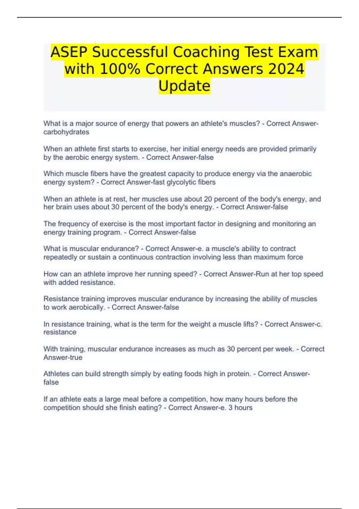 ASEP Successful Coaching Test Exam with 100% Correct Answers 2024 Update ASEP Successful Coaching Test Exam with 100% Correct Answers 2024 Update What is a major source of energy that powers an athlete's muscles? - Correct Answer-carbohydrates When an athlete first starts to exercise, her initial energy needs are provided primarily by the aerobic energy system. - Correct Answer-false Which muscle fibers have the greatest capacity to produce energy via the anaerobic energy system? - Correct Answer-fast glycolytic fibers When an athlete is at rest, her muscles use about 20 percent of the body's energy, and her brain uses about 30 percent of the body's energy. - Correct Answer-false The frequency of exercise is the most important factor in designing and monitoring an energy training program. - Correct Answer-false What is muscular endurance? - Correct Answer-e. a muscle's ability to contract repeatedly or sustain a continuous contraction involving less than maximum force How can an athlete improve her running speed? - Correct Answer-Run at her top speed with added resistance. Resistance training improves muscular endurance by increasing the ability of muscles to work aerobically. - Correct Answer-false In resistance training, what is the term for the weight a muscle lifts? - Correct Answer-c. resistance With training, muscular endurance increases as much as 30 percent per week. - Correct Answer-true Athletes can build strength simply by eating foods high in protein. - Correct Answer-false If an athlete eats a large meal before a competition, how many hours before the competition should she finish eating? - Correct Answer-e. 3 hours During the hottest months, an athlete should consume as much salt as he can. - Correct Answer-false The risk of eating disorders among athletes is increased by which factor(s)? - Correct Answer-c. personal attributes of perfectionism A healthy diet includes 10 to 15 percent fat. - Correct Answer-false Athletes should limit the amount of weight they try to lose to two or fewer pounds per week. - Correct Answer-true Which diet should be best for most athletes? - Correct Answer-e. 55 percent carbohydrate, 25 percent fat, and 20 percent protein Generally, using scare tactics in drug education programs is ineffective with high school athletes. - Correct Answer-true ***What should a coach do immediately after she has determined an athlete has a drug problem and violated the team's dug policy? - Correct Answer-a. Provide counseling on how to deal with the problem. Blood doping to increase an athlete's oxygen supply is permitted in most endurance sports. - Correct Answer-false If a coach needs to seek help for an athlete with a drug problem, what person or people would likely be most appropriate to contact? - Correct Answer-d. the athlete's parents or guardians What does the current evidence indicate about drug testing? - Correct Answer-d. It is not as effective as well-designed educational programs. A coach should ensure that his athletes participate in drug education. - Correct Answer-true The principle of progression is best described by which statement(s)? - Correct Answer-b. Fitness levels will improve as physical demands are continually increased. Fitness testing can help a coach assess the athletes' subsequent training progress. - Correct Answer-true Soccer players—except for the goalkeepers—require low levels of aerobic fitness. - Correct Answer-false What is the ability to start, stop, and change speed and direction quickly and with precision? - Correct Answer-a. agility Carbon dioxide and lactic acid - Correct Answer-c. are waste products resulting when the body produces energy