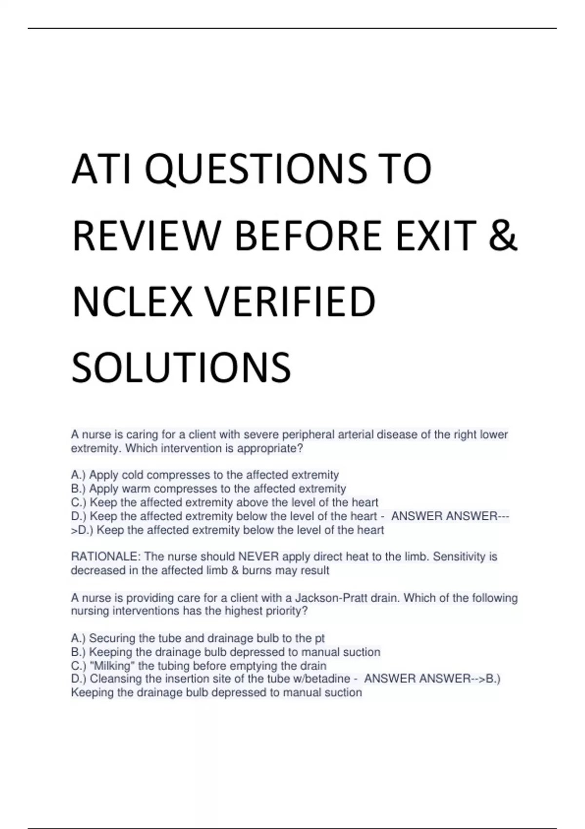 ATI QUESTIONS TO REVIEW BEFORE EXIT & NCLEX VERIFIED SOLUTIONS A nurse is caring for a client with severe peripheral arterial disease of the right lower extremity. Which intervention is appropriate? A.) Apply cold compresses to the affected extremity B.) Apply warm compresses to the affected extremity C.) Keep the affected extremity above the level of the heart D.) Keep the affected extremity below the level of the heart - ANSWER ANSWER--- >D.) Keep the affected extremity below the level of the heart RATIONALE: The nurse should NEVER apply direct heat to the limb. Sensitivity is decreased in the affected limb & burns may result A nurse is providing care for a client with a Jackson-Pratt drain. Which of the following nursing interventions has the highest priority? A.) Securing the tube and drainage bulb to the pt B.) Keeping the drainage bulb depressed to manual suction C.) "Milking" the tubing before emptying the drain D.) Cleansing the insertion site of the tube w/betadine - ANSWER ANSWER-->B.) Keeping the drainage bulb depressed to manual suction RATIONALE: Securing the tubing helps to keep tension from being placed on the tubing & bulb. While this is helpful, maintaining the bulb to suction is the highest priority nursing intervention A client is scheduled for surgery. Which of the following findings should the nurse report to the provider prior to surgery? A.) Serum potassium of 3.8 mEq/L B.) A missing identification band C.) Increased anxiety level D.) A decrease in BP - ANSWER ANSWER-->D.) A decrease in BP RATIONALE: If a missing ID band is noted the nurse can recreate the band prior to proceeding to the operating room. The ID band is a method of properly identifying a pt & necessary for care A client is undergoing cystoscopy. Which of the following interventions should the nurse include in the client's plan of care? A.) Provide education on home urinary catheter care B.) Monitor for infection for 48-72 hours following procedure C.) Increase oral fluid intake to flush contrast dye from system D) Educate pt on the need for anticoagulant therapy - ANSWER ANSWER--->B) Monitor for infection for 48-72 hours following procedure RATIONALE: Cystoscopy does not require administration of contrast dye A nurse is caring for a post-operative client who underwent thoracic surgery 7 hours prior, and now has in place a chest tube for drainage. What finding would require the nurse to contact the provider immediately? A.) Chest tube & tubing become disconnected during pt transfer B) Pt complains of left-sided chest pain of 7 on pain scale when performing incentive spirometry C) Chest tube drainage measures 80 mLs/hr of red blood D) Diminished breath sounds auscultated in left lower lobe - ANSWER ANSWER-->C) Chest tube drainage measures 80mL/hr of red blood RATIONALE: If the tubing separates the RN will ask the pt to exhale as much air as they can to remove air from the pleural space & the nurse would cleanse the tips & reconnect the tubing A nurse is reinforcing teaching with a client who has been recently diagnosed with osteoporosis. Which of the following should be included? A.) Increase intake of dietary calcium b. Walking for one to two hours daily is recommended. c. Eliminate safety hazards in the home d. Long-term estrogen replacement therapy will be required. - ANSWER ANSWER-- >C.) Eliminate safety hazards in the home RATIONALE: Intake of calcium alone is not a treatment for osteoporosis, but calcium is an important part of a prevention program to promote bone health. Most people do not get enough calcium in their diet, and therefore calcium supplements are needed. A nurse is evaluating placement of a nasogastric (NG) tube. Which of the following is the least reliable method to determine correct NG tube placement? a. Aspirate to collect gastric content. b. Test pH of gastric contents c. Ask the client to talk. d. Inject air into tube and listen over abdomen. - ANSWER ANSWER-->D.) Inject air into tube and listen over abdomen RATIONALE: Other than X-ray, aspiration of gastric contents with pH testing is the most reliable method to determine correct NG tube placement. A pH of 4 or less is expected. A nurse is caring for a client with heart failure. Which of the following interventions should the nurse take if the client is experiencing dyspnea? a. Place client in high Fowler's position. b. Place client in the reverse trendelenberg position c. Perform coughing and deep breathing exercises every 8 hours. d. Obtain serial ABGs every 8 hours. - ANSWER ANSWER-->A) Place pt in high fowler's position RATIONALE: Placing the client in reverse trendelenberg would not promote lung expansion and improve oxygenation as well as high Fowler's position. A nurse is providing education to a client with coronary artery disease. Which of the following cholesterol values should the nurse identify as a goal f