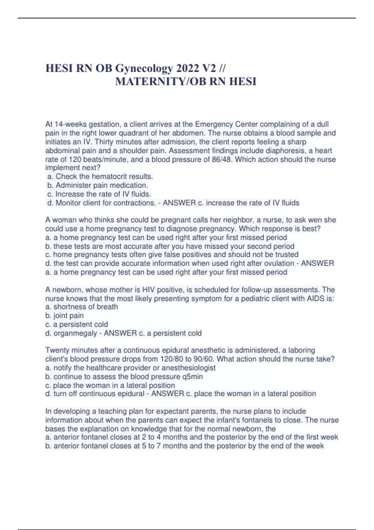 At 14-weeks gestation, a client arrives at the Emergency Center complaining of a dull pain in the right lower quadrant of her abdomen. The nurse obtains a blood sample and initiates an IV. Thirty minutes after admission, the client reports feeling a sharp abdominal pain and a shoulder pain. Assessment findings include diaphoresis, a heart rate of 120 beats/minute, and a blood pressure of 86/48. Which action should the nurse implement next? a. Check the hematocrit results. b. Administer pain medication. c. Increase the rate of IV fluids. d. Monitor client for contractions. - ANSWER c. increase the rate of IV fluids A woman who thinks she could be pregnant calls her neighbor, a nurse, to ask wen she could use a home pregnancy test to diagnose pregnancy. Which response is best? a. a home pregnancy test can be used right after your first missed period b. these tests are most accurate after you have missed your second period c. home pregnancy tests often give false positives and should not be trusted d. the test can provide accurate information when used right after ovulation - ANSWER a. a home pregnancy test can be used right after your first missed period A newborn, whose mother is HIV positive, is scheduled for follow-up assessments. The nurse knows that the most likely presenting symptom for a pediatric client with AIDS is: a. shortness of breath b. joint pain c. a persistent cold d. organmegaly - ANSWER c. a persistent cold Twenty minutes after a continuous epidural anesthetic is administered, a laboring client's blood pressure drops from 120/80 to 90/60. What action should the nurse take? a. notify the healthcare provider or anesthesiologist b. continue to assess the blood pressure q5min c. place the woman in a lateral position d. turn off continuous epidural - ANSWER c. place the woman in a lateral position In developing a teaching plan for expectant parents, the nurse plans to include information about when the parents can expect the infant's fontanels to close. The nurse bases the explanation on knowledge that for the normal newborn, the a. anterior fontanel closes at 2 to 4 months and the posterior by the end of the first week b. anterior fontanel closes at 5 to 7 months and the posterior by the end of the week c. anterior fontanel closes at 8 to 11 months and the posterior by the end of the second week d. anterior fontanel closes at 12 to 18 months and the posterior by the end of the second month - ANSWER d. anterior fontanel closes at 12 to 18 months and the posterior by the end of the second month A client in active labor is admitted with preeclampsia. Which assessment finding is most significant in planning this client's care? a. patellar reflex 4+ b. blood pressure 158/80 c. four hour urine output 240 ml d. respiration 12/minute - ANSWER a. patellar reflex 4+ A 4 week old premature infant has been receiving epoetin alfa for the last three weeks. Which assessment finding indicates to the nurse that the drug is effective? a. slowly increasing urine output over the last week b. respiratory rate changes from the 40s to the 60s c. changes in apical heart rate from the 180 to the 140s d. change in indirect bilirubin from 12 mg/dl to 8 mg/dl - ANSWER c. changes in apical rate from the 180s to the 140s A pregnant client tells the nurse that the first day of her last menstrual period was August 2, 2006. Based on Nagele's rule, what is the estimated date of delivery? a. April 25, 2007 b. May 9, 2007 c. May 29, 2007 d. June 2, 2007 - ANSWER b. May 9, 2007 The nurse is performing a AGA on a full-term newborn during the first hour of transition using the Dubowitz scale. Based on this assessment, the nurse determines that the neonate has a maturity rating of 40 weeks. Which findings should the nurse identify to determine if the neonate is SGA? (Select all that apply.) a. admission weight of 4 lbs 15 oz b. head to heel length of 17 in c. frontal occipital circumference of 12.5 in d. skin smooth with visible veins and abundant vernix e. anterior plantar crease and smooth heel surfaces f. full flexion of all extremities in resting supine position - ANSWER a, b, c The nurse assess a client admitted to the labor and delivery unit and obtains the following data: BP 110/68, FHR 110 bpm, cervix 1 cm dilated and uneffaced. Based on these assessment findings, what intervention should the nurse implement? a. insert a fetal monitor b. assess for cervical changes q1H c. monitor bleeding from IV sites d. perform Leopold's maneuvers - ANSWER c. monitor for bleeding from IV sites Immediately after birth a newborn infant is suctioned, dried, and placed under a radiant warmer. The infant has spontaneous respirations and the nurse assess an apical heart rate of 80 bpm and respirations 20. What action should the nurse perform next? a. initiate positive pressure ventilation b. intervene after one minute APGAR is assessed c. initiate CPR on the infant d. assess the infant's blood glucose level - ANSWER a. initiate positive pressure ventilation A client with no prenatal care arrives at the labor unit screaming, "The baby is coming!" The nurse performs a vaginal examination that reveals the cervix is 3 cm dilated and 75% effaced. What additional information is most important for the nurse to obtain? a. gravidity and parity b. time and amount of last oral intake c. date of last normal menstrual period d. frequency and intensity of contractions - ANSWER c. date of last normal menstrual period A mutigravida client at 41 weeks gestation present in the labor and delivery unit after a non-stress test indicated that the fetus is experiencing some difficulties in utero. Which diagnostic test should the nurse prepare the client for additional information about fetal status? a. biophysical profile b. ultrasound for fetal abnormalities c. maternal serum alpha-fetoprotein screening d. percutaneous umbilical blood sampling - ANSWER a. biophysical profile A client receiving epidural anesthesia begins to experience nausea and bec