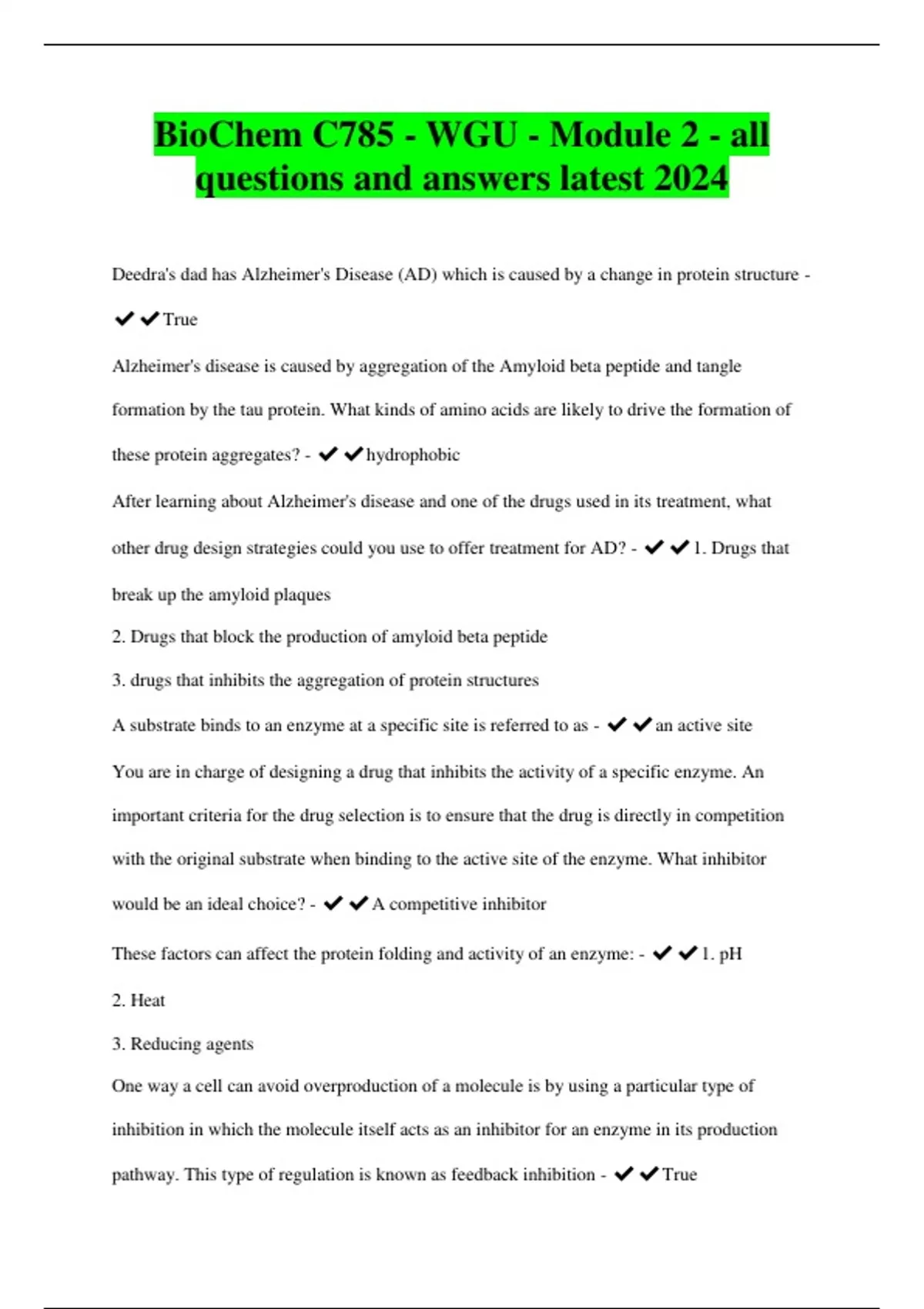 BioChem C785 - WGU - Module 2 - all questions and answers latest 2024 Deedra's dad has Alzheimer's Disease (AD) which is caused by a change in protein structure - ️️True Alzheimer's disease is caused by aggregation of the Amyloid beta peptide and tangle formation by the tau protein. What kinds of amino acids are likely to drive the formation of these protein aggregates? - ️️hydrophobic After learning about Alzheimer's disease and one of the drugs used in its treatment, what other drug design strategies could you use to offer treatment for AD? - ️️1. Drugs that break up the amyloid plaques 2. Drugs that block the production of amyloid beta peptide 3. drugs that inhibits the aggregation of protein structures A substrate binds to an enzyme at a specific site is referred to as - ️️an active site You are in charge of designing a drug that inhibits the activity of a specific enzyme. An important criteria for the drug selection is to ensure that the drug is directly in competition with the original substrate when binding to the active site of the enzyme. What inhibitor