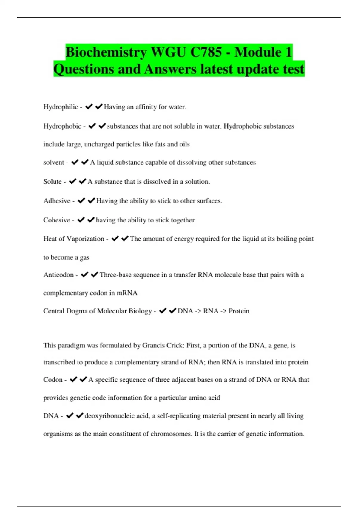 Biochemistry WGU C785 - Module 1 Questions and Answers latest update test Hydrophilic - ️️Having an affinity for water. Hydrophobic - ️️substances that are not soluble in water. Hydrophobic substances include large, uncharged particles like fats and oils solvent - ️️A liquid substance capable of dissolving other substances Solute - ️️A substance that is dissolved in a solution. Adhesive - ️️Having the ability to stick to other surfaces. Cohesive - ️️having the ability to stick together Heat of Vaporization - ️️The amount of energy required for the liquid at its boiling point to become a gas