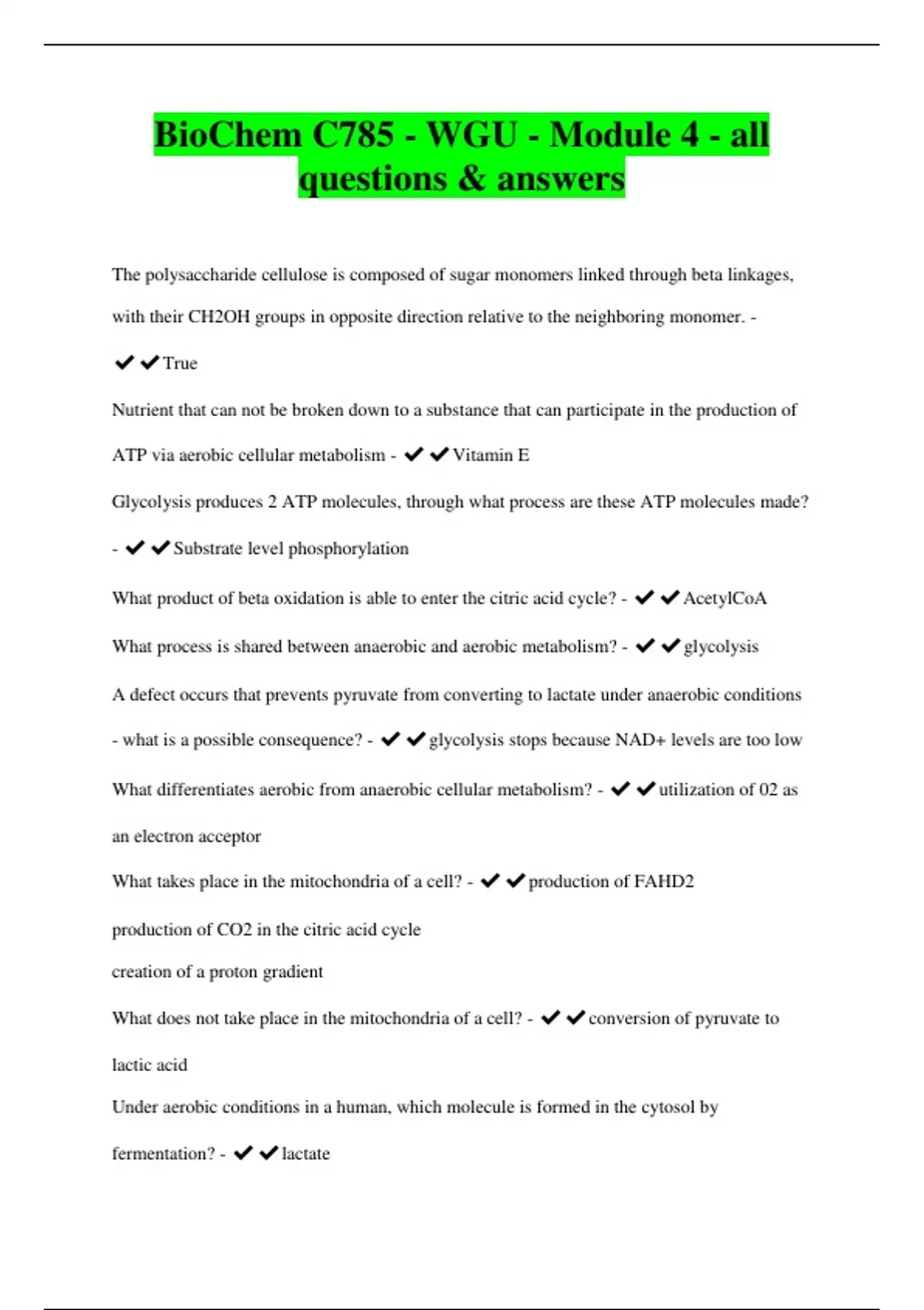 BioChem C785 - WGU - Module 4 - all questions & answers The polysaccharide cellulose is composed of sugar monomers linked through beta linkages, with their CH2OH groups in opposite direction relative to the neighboring monomer. - ️️True Nutrient that can not be broken down to a substance that can participate in the production of ATP via aerobic cellular metabolism - ️️Vitamin E Glycolysis produces 2 ATP molecules, through what process are these ATP molecules made? - ️️Substrate level phosphorylation What product of beta oxidation is able to enter the citric acid cycle? - ️️AcetylCoA What process is shared between anaerobic and aerobic metabolism? - ️️glycolysis A defect occurs that prevents pyruvate from converting to lactate under anaerobic conditions - what is a possible consequence? - ️️glycolysis stops because NAD+ levels are too low What differentiates aerobic from anaerobic cellular metabolism? - ️️utilization of 02 as an electron acceptor What takes place in the mitochondria of a cell? - ️️production of FAHD2 production of CO2 in the citric acid cycle creation of a proton gradient