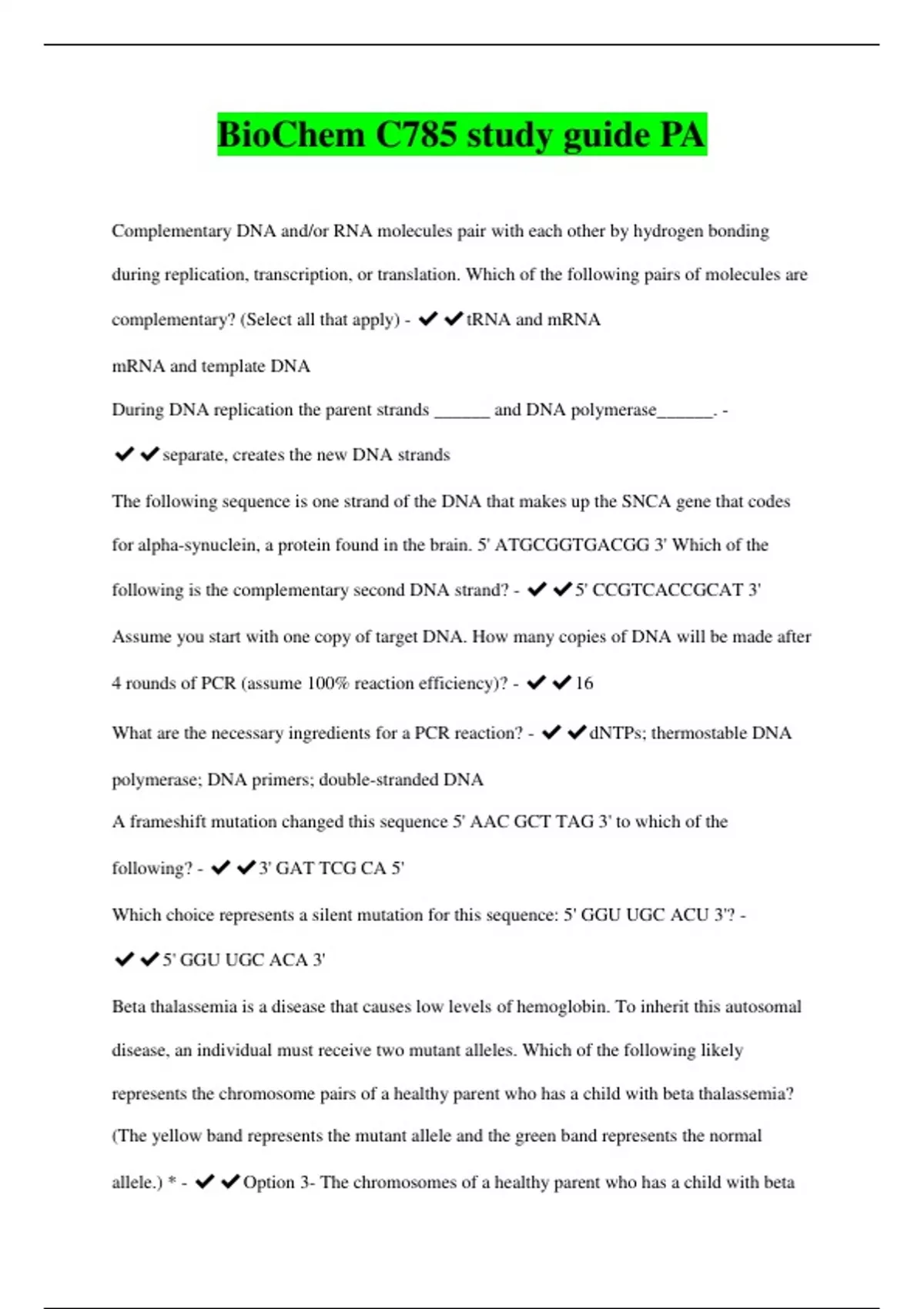 BioChem C785 study guide PA Complementary DNA and/or RNA molecules pair with each other by hydrogen bonding during replication, transcription, or translation. Which of the following pairs of molecules are complementary? (Select all that apply) - ️️tRNA and mRNA mRNA and template DNA During DNA replication the parent strands ______ and DNA polymerase______. - ️️separate, creates the new DNA strands The following sequence is one strand of the DNA that makes up the SNCA gene that codes for alpha-synuclein, a protein found in the brain. 5' ATGCGGTGACGG 3' Which of the following is the complementary second DNA strand? - ️️5' CCGTCACCGCAT 3' Assume you start with one copy of target DNA. How many copies of DNA will be made after 4 rounds of PCR (assume 100% reaction efficiency)? - ️️16 What are the necessary ingredients for a PCR reaction? - ️️dNTPs; thermostable DNA polymerase; DNA primers; double-stranded DNA A frameshift mutation changed this sequence 5' AAC GCT TAG 3' to which of the following? - ️️3' GAT TCG CA 5'