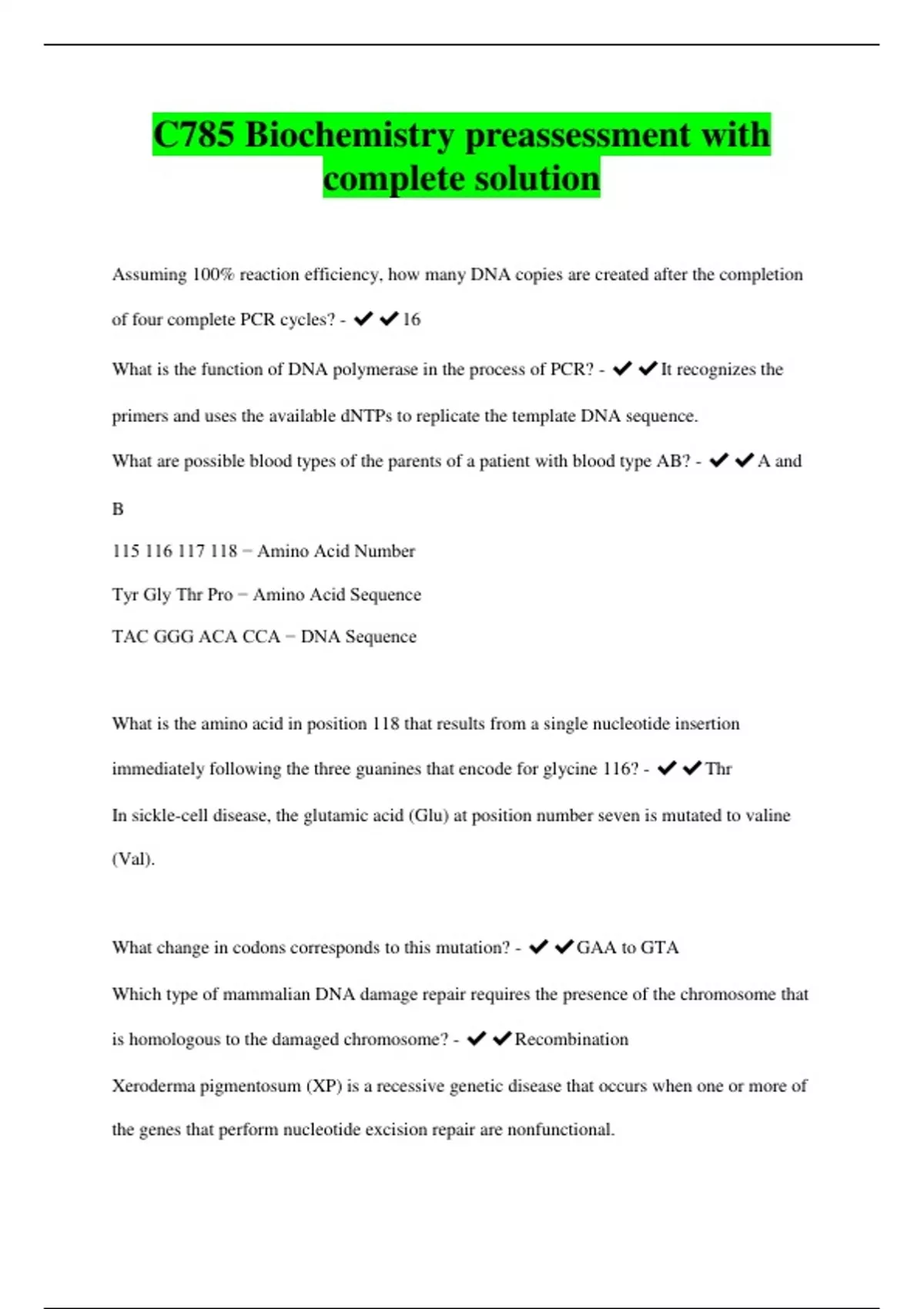 C785 Biochemistry preassessment with complete solution Assuming 100% reaction efficiency, how many DNA copies are created after the completion of four complete PCR cycles? - ️️16 What is the function of DNA polymerase in the process of PCR? - ️️It recognizes the primers and uses the available dNTPs to replicate the template DNA sequence. What are possible blood types of the parents of a patient with blood type AB? - ️️A and B − Amino Acid Number Tyr Gly Thr Pro − Amino Acid Sequence TAC GGG ACA CCA − DNA Sequence What is the amino acid in position 118 that results from a single nucleotide insertion immediately following the three guanines that encode for glycine 116? - ️️Thr In sickle-cell disease, the glutamic acid (Glu) at position number seven is mutated to valine (Val). What change in codons corresponds to this mutation? - ️️GAA to GTA Which type of mammalian DNA damage repair requires the presence of the chromosome that is homologous to the damaged chromosome? - ️️Recombination