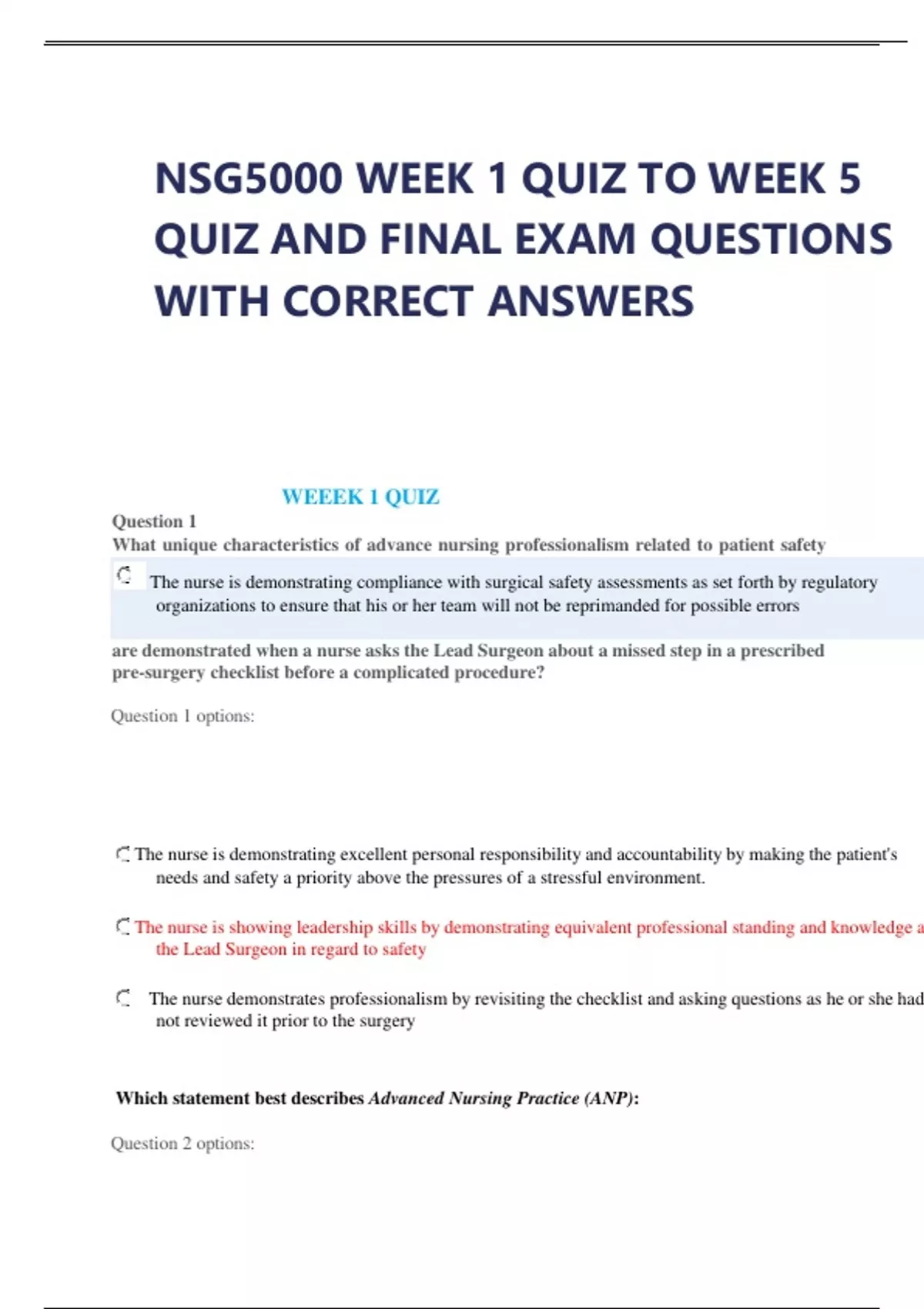 NSG5000 WEEK 1 QUIZ TO WEEK 5 QUIZ AND FINAL EXAM QUESTIONS WITH CORRECT ANSWERS Question 1 WEEEK 1 QUIZ What unique characteristics of advance nursing professionalism related to patient safety are demonstrated when a nurse asks the Lead Surgeon about a missed step in a prescribed pre-surgery checklist before a complicated procedure? Question 1 options: The nurse is demonstrating excellent personal responsibility and accountability by making the patient's needs and safety a priority above the pressures of a stressful environment. The nurse is showing leadership skills by demonstrating equivalent professional standing and knowledge as the Lead Surgeon in regard to safety The nurse demonstrates professionalism by revisiting the checklist and asking questions as he or she had not reviewed it prior to the surgery Which statement best describes Advanced Nursing Practice (ANP): Question 2 options: The nurse is demonstrating compliance with surgical safety assessments as set forth by regulatory organizations to ensure that his or her team will not be reprimanded for possible errors Advance Nursing Practice is the integration and application of a broad range of theoretical and evidencebased knowledge that occurs as part of graduate education. Advance Nursing Practice is indistinguishable from the Advanced practice nurse with broad definitions to describe specific roles. Advance Nursing Practice is the integration of all levels and specializations in nursing that directs patient care to individual patients, families and communities. The nurse in advanced practice understands which statement as representing the fundamental difference between nursing and medicine as disciplines? (Bloom’s: Analysis) Advance Nursing Practice is any form of a nursing intervention that influences health care outcomes, including the direct care, management of care, administration of nursing and health care organizations, and the development and implementation of health policy. Question 3 options: Nursing requires more applied practice in the field before receiving certification. Nursing is perceived as a philosophy while medicine is viewed as an evidence-based practice. Teaching is often seen as a career path in nursing more often than in medicine. Which instance represents appropriate patient-centered consultation between a Nurse Practitioner and a physician from another practice? (Bloom’s: Application) Question 4 options: The NP might seek a second opinion to confirm a diagnosis or proper treatment, especially if he or she has limited experience with the presented health issue.