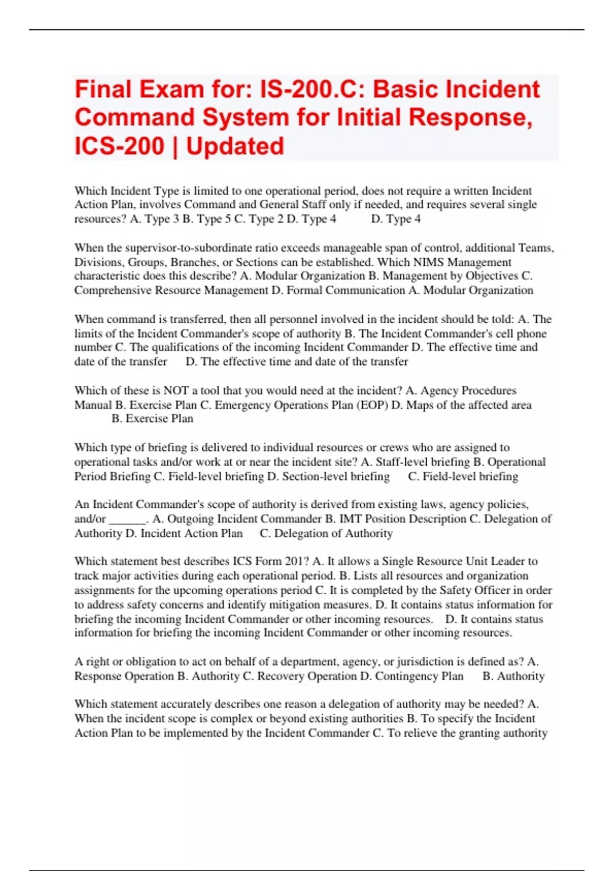 Final Exam for: IS-200.C: Basic Incident Command System for Initial Response, ICS-200 | Updated