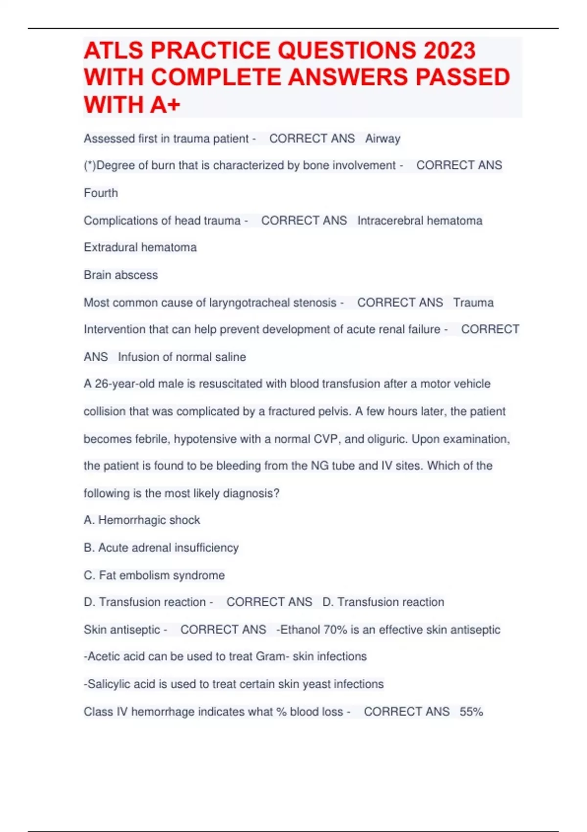 Assessed first in trauma patient - CORRECT ANS Airway (*)Degree of burn that is characterized by bone involvement - CORRECT ANS Fourth Complications of head trauma - CORRECT ANS Intracerebral hematoma Extradural hematoma Brain abscess Most common cause of laryngotracheal stenosis - CORRECT ANS Trauma Intervention that can help prevent development of acute renal failure - CORRECT ANS Infusion of normal saline A 26-year-old male is resuscitated with blood transfusion after a motor vehicle collision that was complicated by a fractured pelvis. A few hours later, the patient becomes febrile, hypotensive with a normal CVP, and oliguric. Upon examination, the patient is found to be bleeding from the NG tube and IV sites. Which of the following is the most likely diagnosis? A. Hemorrhagic shock B. Acute adrenal insufficiency C. Fat embolism syndrome D. Transfusion reaction - CORRECT ANS D. Transfusion reaction Skin antiseptic - CORRECT ANS -Ethanol 70% is an effective skin antiseptic -Acetic acid can be used to treat Gram- skin infections -Salicylic acid is used to treat certain skin yeast infections Class IV hemorrhage indicates what % blood loss - CORRECT ANS 55%