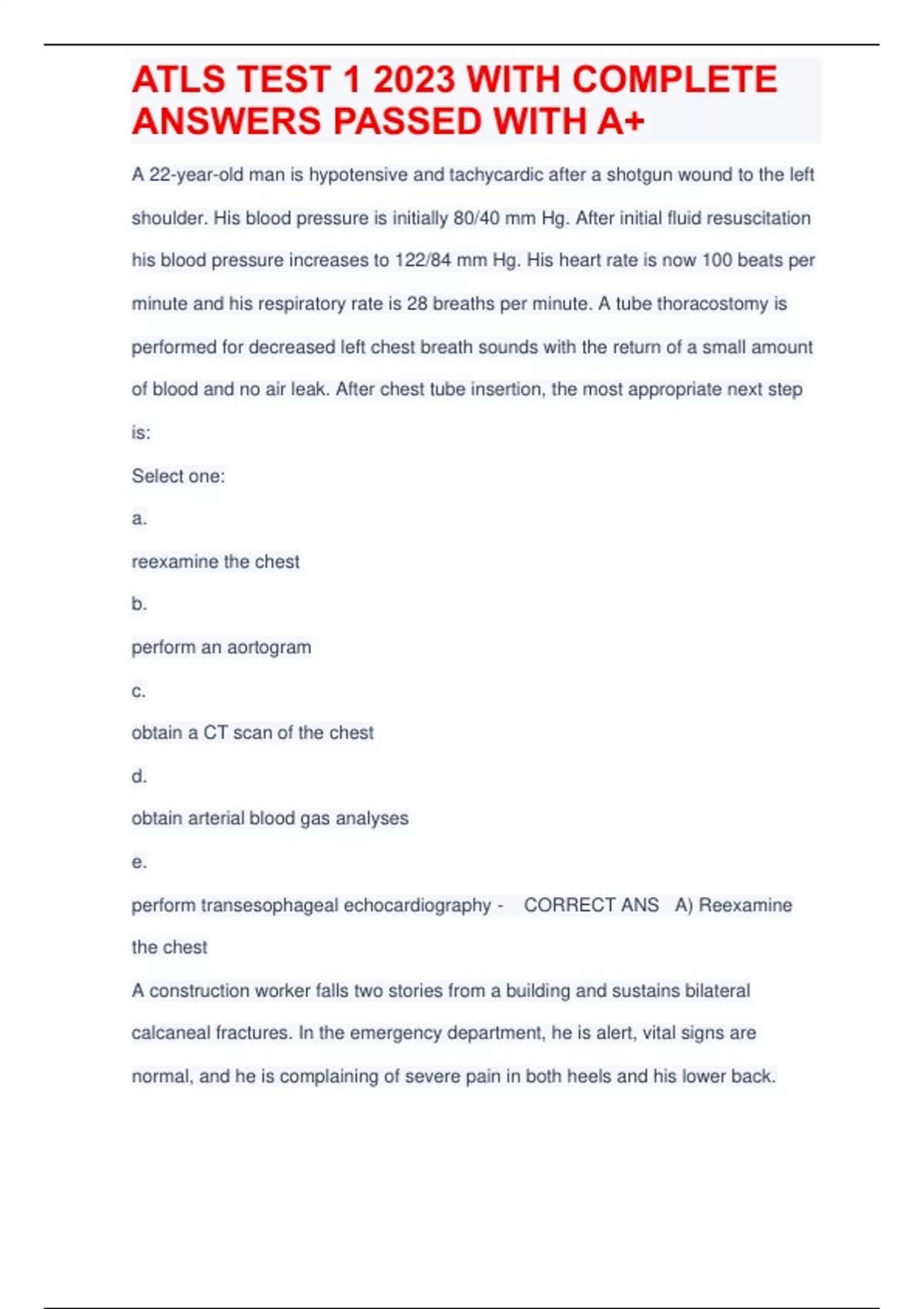 A 22-year-old man is hypotensive and tachycardic after a shotgun wound to the left shoulder. His blood pressure is initially 80/40 mm Hg. After initial fluid resuscitation his blood pressure increases to 122/84 mm Hg. His heart rate is now 100 beats per minute and his respiratory rate is 28 breaths per minute. A tube thoracostomy is performed for decreased left chest breath sounds with the return of a small amount of blood and no air leak. After chest tube insertion, the most appropriate next step is: Select one: a. reexamine the chest b. perform an aortogram c. obtain a CT scan of the chest d. obtain arterial blood gas analyses e. perform transesophageal echocardiography - CORRECT ANS A) Reexamine the chest A construction worker falls two stories from a building and sustains bilateral calcaneal fractures. In the emergency department, he is alert, vital signs are normal, and he is complaining of severe pain in both heels and his lower back.