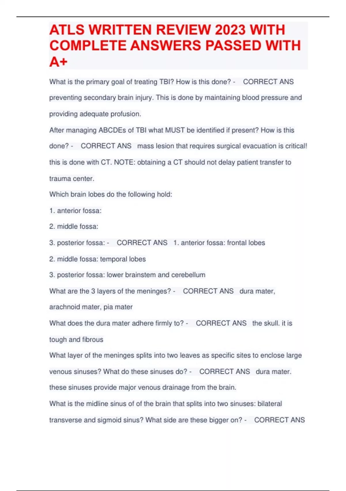 What is the primary goal of treating TBI? How is this done? - CORRECT ANS preventing secondary brain injury. This is done by maintaining blood pressure and providing adequate profusion. After managing ABCDEs of TBI what MUST be identified if present? How is this done? - CORRECT ANS mass lesion that requires surgical evacuation is critical! this is done with CT. NOTE: obtaining a CT should not delay patient transfer to trauma center. Which brain lobes do the following hold: 1. anterior fossa: 2. middle fossa: 3. posterior fossa: - CORRECT ANS 1. anterior fossa: frontal lobes 2. middle fossa: temporal lobes 3. posterior fossa: lower brainstem and cerebellum What are the 3 layers of the meninges? - CORRECT ANS dura mater, arachnoid mater, pia mater What does the dura mater adhere firmly to? - CORRECT ANS the skull. it is tough and fibrous What layer of the meninges splits into two leaves as specific sites to enclose large venous sinuses? What do these sinuses do? - CORRECT ANS dura mater. these sinuses provide major venous drainage from the brain. What is the midline sinus of of the brain that splits into two sinuses: bilateral transverse and sigmoid sinus? What side are these bigger on? - CORRECT ANS