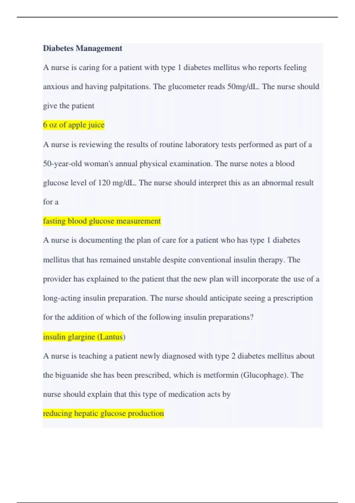 Diabetes Management A nurse is caring for a patient with type 1 diabetes mellitus who reports feeling anxious and having palpitations. The glucometer reads 50mg/dL. The nurse should give the patient 6 oz of apple juice A nurse is reviewing the results of routine laboratory tests performed as part of a 50-year-old woman's annual physical examination. The nurse notes a blood glucose level of 120 mg/dL. The nurse should interpret this as an abnormal result for a fasting blood glucose measurement A nurse is documenting the plan of care for a patient who has type 1 diabetes mellitus that has remained unstable despite conventional insulin therapy. The provider has explained to the patient that the new plan will incorporate the use of a long-acting insulin preparation. The nurse should anticipate seeing a prescription for the addition of which of the following insulin preparations? insulin glargine (Lantus) A nurse is teaching a patient newly diagnosed with type 2 diabetes mellitus about the biguanide she has been prescribed, which is metformin (Glucophage). The nurse should explain that this type of medication acts by reducing hepatic glucose production