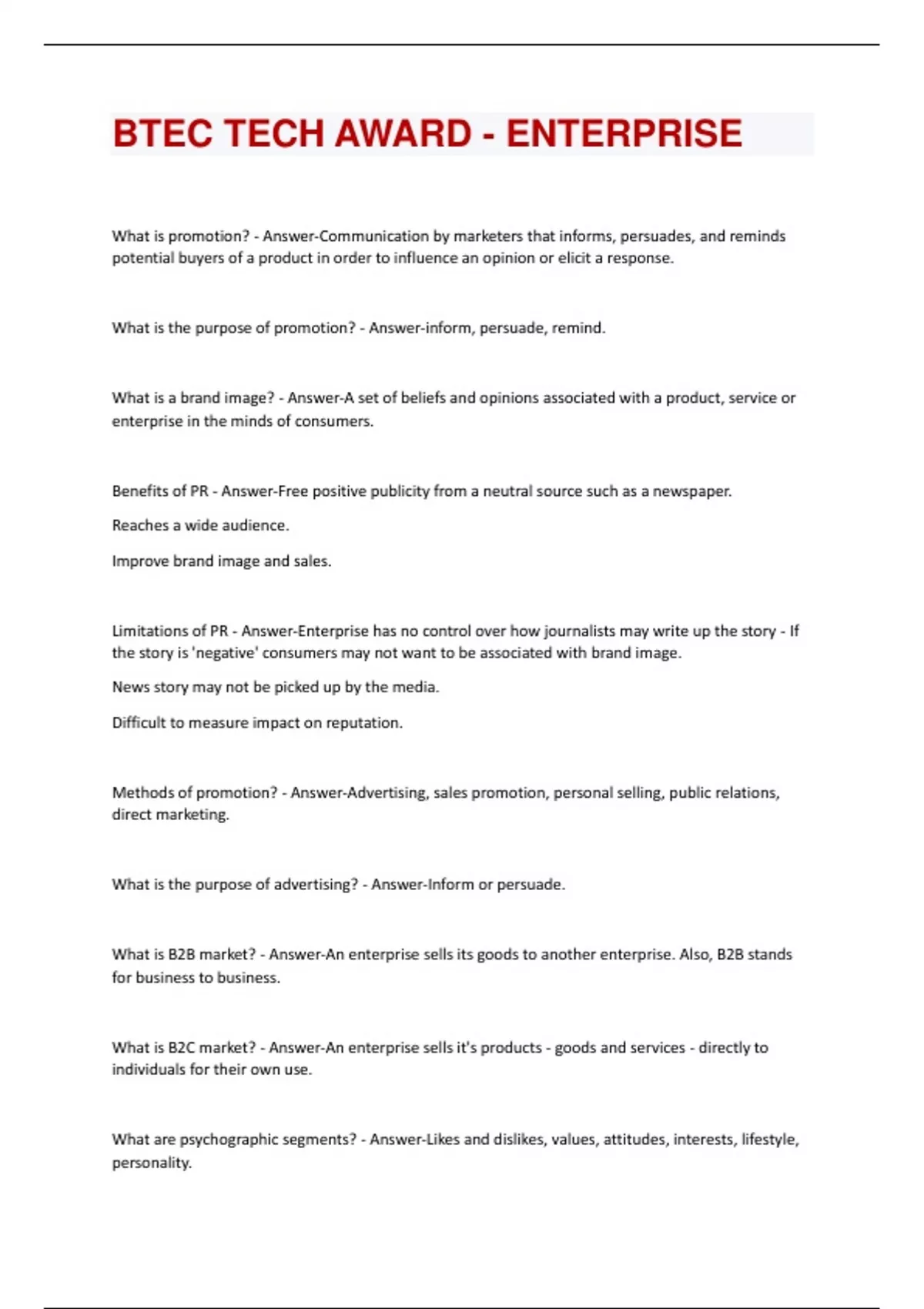 What is promotion? - Answer-Communication by marketers that informs, persuades, and reminds potential buyers of a product in order to influence an opinion or elicit a response. What is the purpose of promotion? - Answer-inform, persuade, remind. What is a brand image? - Answer-A set of beliefs and opinions associated with a product, service or enterprise in the minds of consumers. Benefits of PR - Answer-Free positive publicity from a neutral source such as a newspaper. Reaches a wide audience. Improve brand image and sales. Limitations of PR - Answer-Enterprise has no control over how journalists may write up the story - If the story is 'negative' consumers may not want to be associated with brand image. News story may not be picked up by the media. Difficult to measure impact on reputation. Methods of promotion? - Answer-Advertising, sales promotion, personal selling, public relations, direct marketing. What is the purpose of advertising? - Answer-Inform or persuade. What is B2B market? - Answer-An enterprise sells its goods to another enterprise. Also, B2B stands for business to business. What is B2C market? - Answer-An enterprise sells it's products - goods and services - directly to individuals for their own use. What are psychographic segments? - Answer-Likes and dislikes, values, attitudes, interests, lifestyle, personality.What is the process of financial documents? - Answer-Purchase order - delivery note - invoice - receipt - credit note - statement of account. What types of payment methods are there? - Answer-Debit card, credit card, cash, direct debit, payment technologies, cheque. What are the main two types of running costs? - Answer-Fixed costs and variable costs. Name 4 types of fixed costs? - Answer-Heating and lighting charges, rent, business rates, insurance. Calculating turnover? - Answer-Turnover = Price per item X Quantity sold Calculating retained profit? - Answer-retained profit = Net profit - Amount of net profit paid to owners of enterprise. Calculating net profit? - Answer-Net profit = Gross profit - Expenditure. Examples of assests? - Answer-Cars/trucks, computer equipment, machinery, business premises, inventory, cash in the bank and money owed to the business by it's customers. Types of capital? - Answer-Business loan, retained profit, money invested in the enterprise by the owner. Gross profit margin? - Answer-(Gross profit ÷ sales revenue )x 100