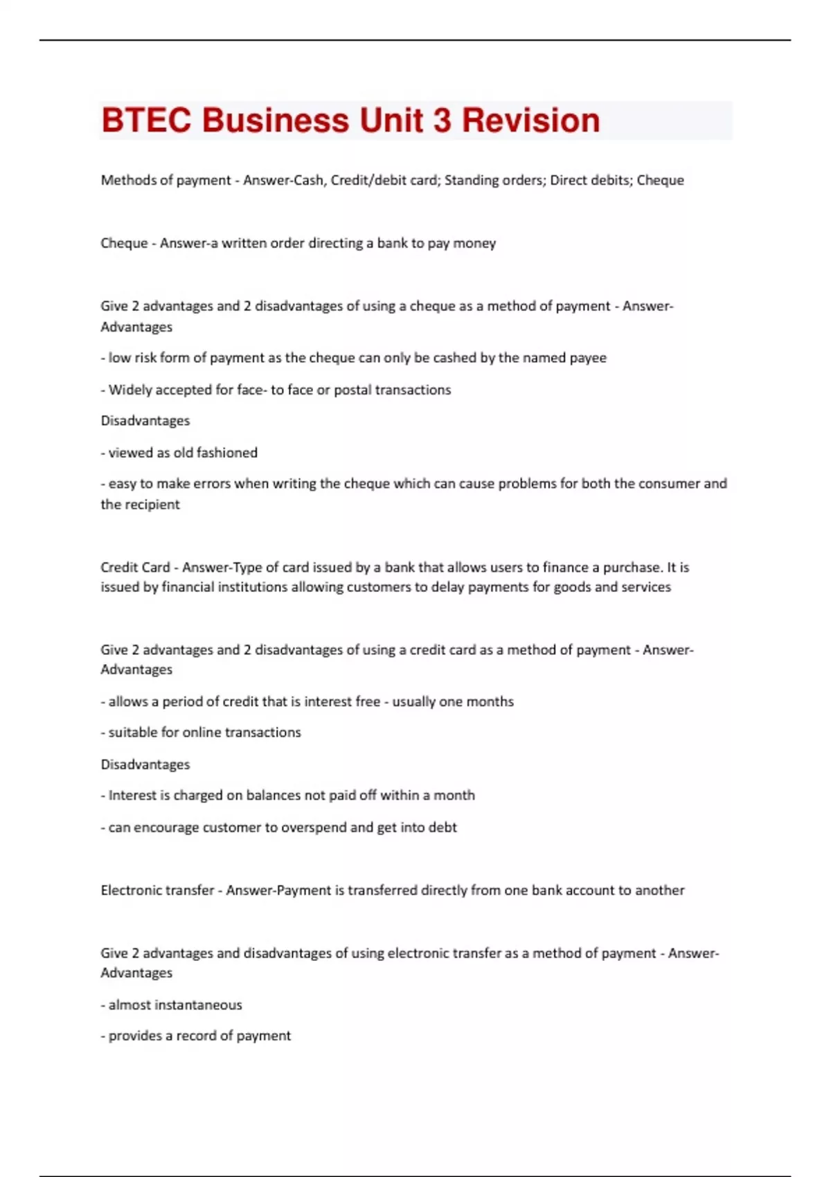 Methods of payment - Answer-Cash, Credit/debit card; Standing orders; Direct debits; Cheque Cheque - Answer-a written order directing a bank to pay money Give 2 advantages and 2 disadvantages of using a cheque as a method of payment - AnswerAdvantages - low risk form of payment as the cheque can only be cashed by the named payee - Widely accepted for face- to face or postal transactions Disadvantages - viewed as old fashioned - easy to make errors when writing the cheque which can cause problems for both the consumer and the recipient Credit Card - Answer-Type of card issued by a bank that allows users to finance a purchase. It is issued by financial institutions allowing customers to delay payments for goods and services Give 2 advantages and 2 disadvantages of using a credit card as a method of payment - AnswerAdvantages - allows a period of credit that is interest free - usually one months - suitable for online transactions Disadvantages - Interest is charged on balances not paid off within a month - can encourage customer to overspend and get into debt Electronic transfer - Answer-Payment is transferred directly from one bank account to another Give 2 advantages and disadvantages of using electronic transfer as a method of payment - AnswerAdvantages - almost instantaneous - provides a record of paymentDisadvantages - Risk or loss if the transfer is set up incorrectly - not appropriate for face to face transactions Cash - Answer-Notes and coins in a wide range of denominations Give 2 advantages and disadvantages of using cash as a method of payment - Answer-Advantages - most widely accepted form of exchange - makes budgeting easier Disadvantages - can be lost or stolen - cannot be used for online purchases Debit card - Answer-A bank card that automatically deducts the amount of a purchase from the checking account of the cardholder Give 2 advantages and disadvantages of using a Debit card as a method of payment - AnswerAdvantages - no need to carry cash - widely accepted & a secure method of payment Disadvantages - short time lapse between making the transaction and the money being drawn from the customers account - Not accepted or appropriate for small transactions Charge card - Answer-A payment type that works just like credit cards except the balance must be paid in full every month. Give 2 advantages and disadvantages of using a Charge card as a method of payment - AnswerAdvantages - allows a short period of credit - offers a high spending limit or no limit at all so larger purchases can be covered easily Disadvantages- Must be paid in full each month - Failure to replay results in very high late payment fees, usually much higher than a standard credit card Contactless card - Answer-A card with an embedded chip that only needs to be held close to a terminal to transfer its data; no PIN number needs to be entered.