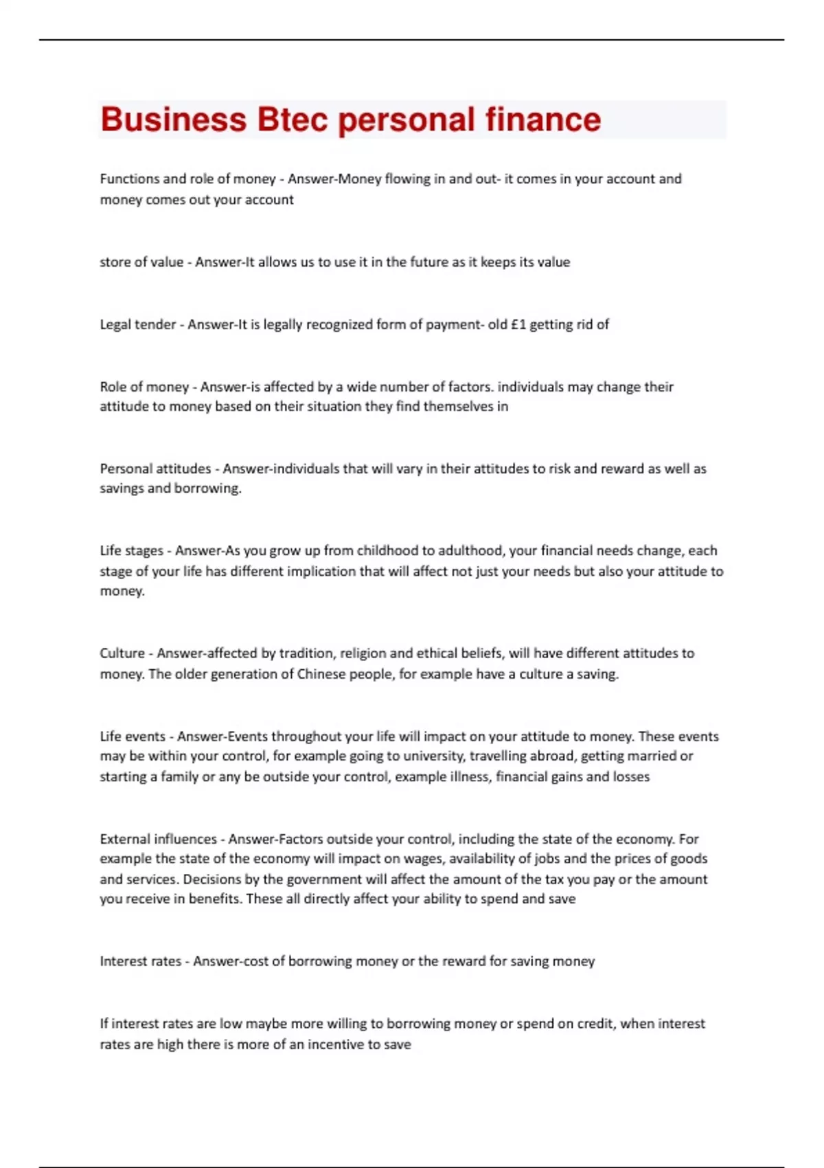 nctions and role of money - Answer-Money flowing in and out- it comes in your account and money comes out your account store of value - Answer-It allows us to use it in the future as it keeps its value Legal tender - Answer-It is legally recognized form of payment- old £1 getting rid of Role of money - Answer-is affected by a wide number of factors. individuals may change their attitude to money based on their situation they find themselves in Personal attitudes - Answer-individuals that will vary in their attitudes to risk and reward as well as savings and borrowing. Life stages - Answer-As you grow up from childhood to adulthood, your financial needs change, each stage of your life has different implication that will affect not just your needs but also your attitude to money. Culture - Answer-affected by tradition, religion and ethical beliefs, will have different attitudes to money. The older generation of Chinese people, for example have a culture a saving. Life events - Answer-Events throughout your life will impact on your attitude to money. These events may be within your control, for example going to university, travelling abroad, getting married or starting a family or any be outside your control, example illness, financial gains and losses External influences - Answer-Factors outside your control, including the state of the economy. For example the state of the economy will impact on wages, availability of jobs and the prices of goods and services. Decisions by the government will affect the amount of the tax you pay or the amount you receive in benefits. These all directly affect your ability to spend and save Interest rates - Answer-cost of borrowing money or the reward for saving money If interest rates are low maybe more willing to borrowing money or spend on credit, when interest rates are high there is more of an incentive to saveDebt - Answer-money that you owe credit rating - Answer-a score given to individual of how likely they are from previously debt based on your previous action solvent - Answer-the ability to meet day by day expenditure inflation - Answer-Inflation is a general risk in prices. This leads to the value of money falling, that is, £10 today was worth less that £10 a year ago. Expenditure now can help counter the effect of inflation cash - Answer-money in coins and notes credit cards - Answer-It's a card that has your money and you can borrow funds