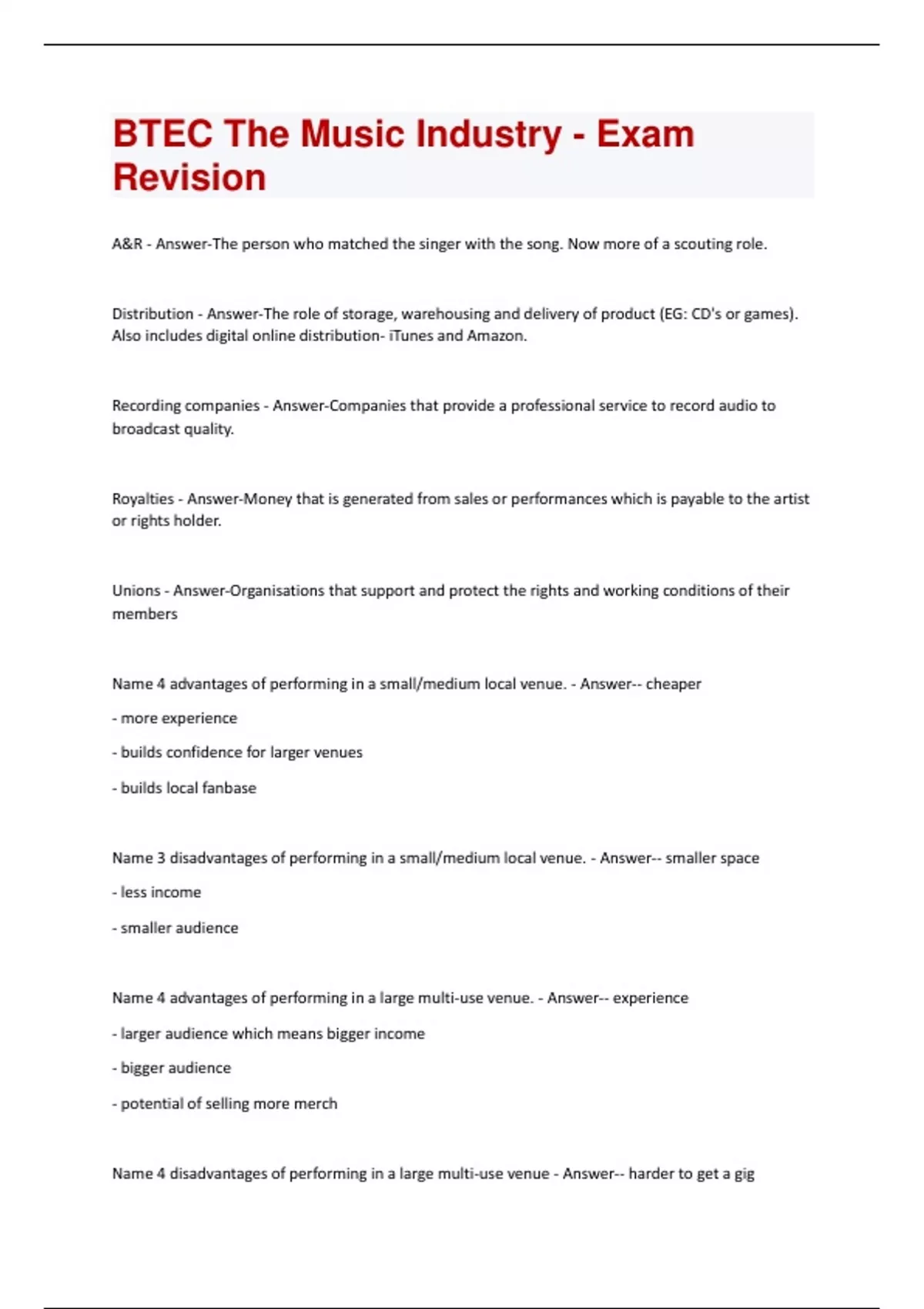 A&R - Answer-The person who matched the singer with the song. Now more of a scouting role. Distribution - Answer-The role of storage, warehousing and delivery of product (EG: CD's or games). Also includes digital online distribution- iTunes and Amazon. Recording companies - Answer-Companies that provide a professional service to record audio to broadcast quality. Royalties - Answer-Money that is generated from sales or performances which is payable to the artist or rights holder. Unions - Answer-Organisations that support and protect the rights and working conditions of their members Name 4 advantages of performing in a small/medium local venue. - Answer-- cheaper - more experience - builds confidence for larger venues - builds local fanbase Name 3 disadvantages of performing in a small/medium local venue. - Answer-- smaller space - less income - smaller audience Name 4 advantages of performing in a large multi-use venue. - Answer-- experience - larger audience which means bigger income - bigger audience - potential of selling more merch Name 4 disadvantages of performing in a large multi-use venue - Answer-- harder to get a gig- more health and safety - harder to connect with audience - more equipment Name 5 different ways of assessing Health and safety within an event. - Answer-- risk assessments - check noise laws - capacity control - disabled access - enough door staff What does a music promoter do? - Answer-- book gigs - marketing - cover venue costs - gain publicity for event - involved with printing companies, record label, venue, sound and lighting. What do recording companies do? - Answer-- find new artists - signs the new artists - maintains contract with artist and manager - sorts out copyright for recordings and videos - helps get music known. - involved with publishing companies Name 4 types of broadcasting - Answer-- social media - TV adverts - radio adverts - adverts on websites Where can your music be broadcasted? - Answer-- retail music stores such as HMV - online music stores such as iTunesWhat do music publishers do? - Answer-- collect royalties - gets songs on movies - secure commissions - ensure copyright is in place