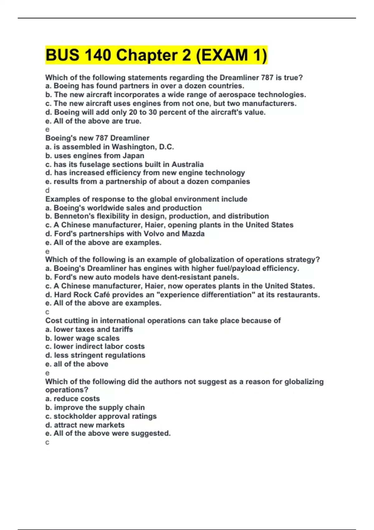 BUS 140 Chapter 2 (EXAM 1) Which of the following statements regarding the Dreamliner 787 is true? a. Boeing has found partners in over a dozen countries. b. The new aircraft incorporates a wide range of aerospace technologies. c. The new aircraft uses engines from not one, but two manufacturers. d. Boeing will add only 20 to 30 percent of the aircraft's value. e. All of the above are true. e Boeing's new 787 Dreamliner a. is assembled in Washington, D.C. b. uses engines from Japan c. has its fuselage sections built in Australia d. has increased efficiency from new engine technology e. results from a partnership of about a dozen companies d Examples of response to the global environment include a. Boeing's worldwide sales and production b. Benneton's flexibility in design, production, and distribution c. A Chinese manufacturer, Haier, opening plants in the United States d. Ford's partnerships with Volvo and Mazda e. All of the above are examples. e Which of the following is an example of globalization of operations strategy? a. Boeing's Dreamliner has engines with higher fuel/payload efficiency. b. Ford's new auto models have dent-resistant panels. c. A Chinese manufacturer, Haier, now operates plants in the United States. d. Hard Rock Café provides an "experience differentiation" at its restaurants. e. All of the above are examples. c Cost cutting in international operations can take place because of a. lower taxes and tariffs b. lower wage scales c. lower indirect labor costs d. less stringent regulations e. all of the above e Which of the following did the authors not suggest as a reason for globalizing operations? a. reduce costs b. improve the supply chain c. stockholder approval ratings d. attract new markets e. All of the above were suggested. c Multinational organizations can shop from country to country and cut costs through a. lower wage scales b. lower indirect labor costs c. less stringent regulations d. lower taxes and tariffs e. all of the above e The term maquiladora is most synonymous with a. free trade zones b. Chinese forced labor camps c. home-based or cottage industry d. areas that do not meet U.S. standards for workplace safety and pollution e. none of the above a Which of the following represent reasons for globalizing operations? a. to gain improvements in the supply chain b. to improve operations c. to expand a product's life cycle d. to attract and retain global talent e. All of the above are valid. e Which of the following does not represent valid reasons for globalizing operations? a. reduce costs b. improve supply chain c. reduce responsiveness d. attract and retain global talent e. All of the above are valid reasons for globalizing operations. c NAFTA seeks to a. substitute cheap labor in Mexico for expensive labor in the United States b. curb illegal immigration from Mexico to the United States c. phase out all trade and tariff barriers between the United States and Mexico d. phase out all trade and tariff barriers between the United States, Canada, and Mexico e. All of the above are NAFTA goals. d With reference to cultural and ethical issues, the World Trade Organization has a. succeeded in providing equal protection of intellectual property among nations b. made progress in providing equal protection of intellectual property among nations c. phased out all trade and tariff barriers between the United States and Mexico d. eliminated slave labor and child labor e. played little role in addressing cultural and ethical issues among nations b Which of the following is true about business strategies? a. An organization should stick with its strategy for the life of the business. b. All firms within an industry will adopt the same strategy. c. Well defined missions make strategy development much easier. d. Strategies are formulated independently of SWOT analysis. e. Organizational strategies depend on operations strategies. c Which of the following activities takes place once the mission has been developed? a. The firm develops alternative or back-up missions in case the original mission fails. b. The functional areas develop their functional area strategies. c. The functional areas develop their supporting missions. d. The ten OM decision areas are prioritized. e. Operational tactics are developed. c Which of the following statements about organizational missions is false? a. They reflect a company's purpose. b. They indicate what a company intends to contribute to society. c. They are formulated after strategies are known. d. They define a company's reason for existence. e. They provide guidance for functional area missions. c The impact of strategies on the general direction and basic character of a company is a. short range b. medium range c. long range d. temporal e. minimal c The fundamental purpose of an organization's mission statement is to a. create a good human relations climate in the organization b. define the organization's purpose in society c. define the operational structure of the organization d. generate good public relations for the organization e. define the functional areas required by the organization b Which of the following is true? a. Corporate mission is shaped by functional strategies. b. Corporate strategy is shaped by functional strategies. c. Functional strategies are shaped by corporate strategy. d. External conditions are shaped by corporate mission. e. Functional area missions are merged to become the organizational mission. c