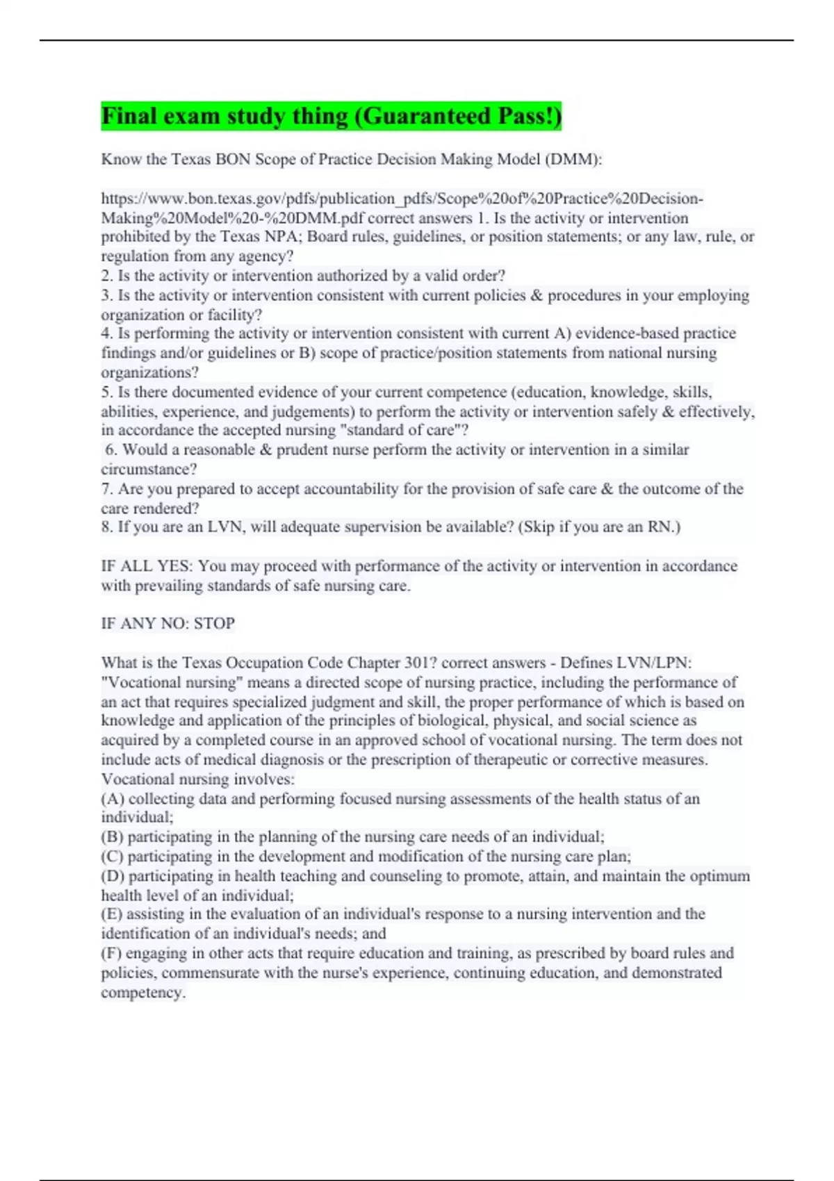 Know the Texas BON Scope of Practice Decision Making Model (DMM): 2. Is the activity or intervention authorized by a valid order? 3. Is the activity or intervention consistent with current policies & procedures in your employing organization or facility? 4. Is performing the activity or intervention consistent with current A) evidence‐based practice findings and/or guidelines or B) scope of practice/position statements from national nursing organizations? 5. Is there documented evidence of your current competence (education, knowledge, skills, abilities, experience, and judgements) to perform the activity or intervention safely & effectively, in accordance the accepted nursing "standard of care"? 6. Would a reasonable & prudent nurse perform the activity or intervention in a similar circumstance? 7. Are you prepared to accept accountability for the provision of safe care & the outcome of the care rendered? 8. If you are an LVN, will adequate supervision be available? (Skip if you are an RN.) IF ALL YES: You may proceed with performance of the activity or intervention in accordance with prevailing standards of safe nursing care. IF ANY NO: STOP What is the Texas Occupation Code Chapter 301? correct answers - Defines LVN/LPN: "Vocational nursing" means a directed scope of nursing practice, including the performance of an act that requires specialized judgment and skill, the proper performance of which is based on knowledge and application of the principles of biological, physical, and social science as acquired by a completed course in an approved school of vocational nursing. The term does not include acts of medical diagnosis or the prescription of therapeutic or corrective measures. Vocational nursing involves: (A) collecting data and performing focused nursing assessments of the health status of an individual; (B) participating in the planning of the nursing care needs of an individual; (C) participating in the development and modification of the nursing care plan; (D) participating in health teaching and counseling to promote, attain, and maintain the optimum health level of an individual; (E) assisting in the evaluation of an individual's response to a nursing intervention and the identification of an individual's needs; and (F) engaging in other acts that require education and training, as prescribed by board rules and policies, commensurate with the nurse's experience, continuing education, and demonstrated competency.