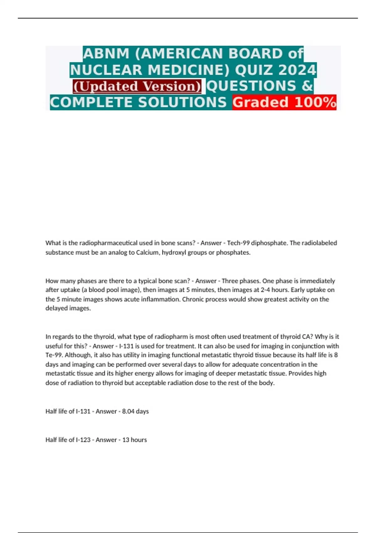 ABNM (AMERICAN BOARD of NUCLEAR MEDICINE) QUIZ 2024 (Updated Version) QUESTIONS & COMPLETE SOLUTIONS Graded 100% Questions & Answers For Example: What radioisotope is most often used for thyroid function and imaging? - Answer - I-123. This has a photon energy of 159 Kev - This gamma energy allows excellent image capture with limited background activity.