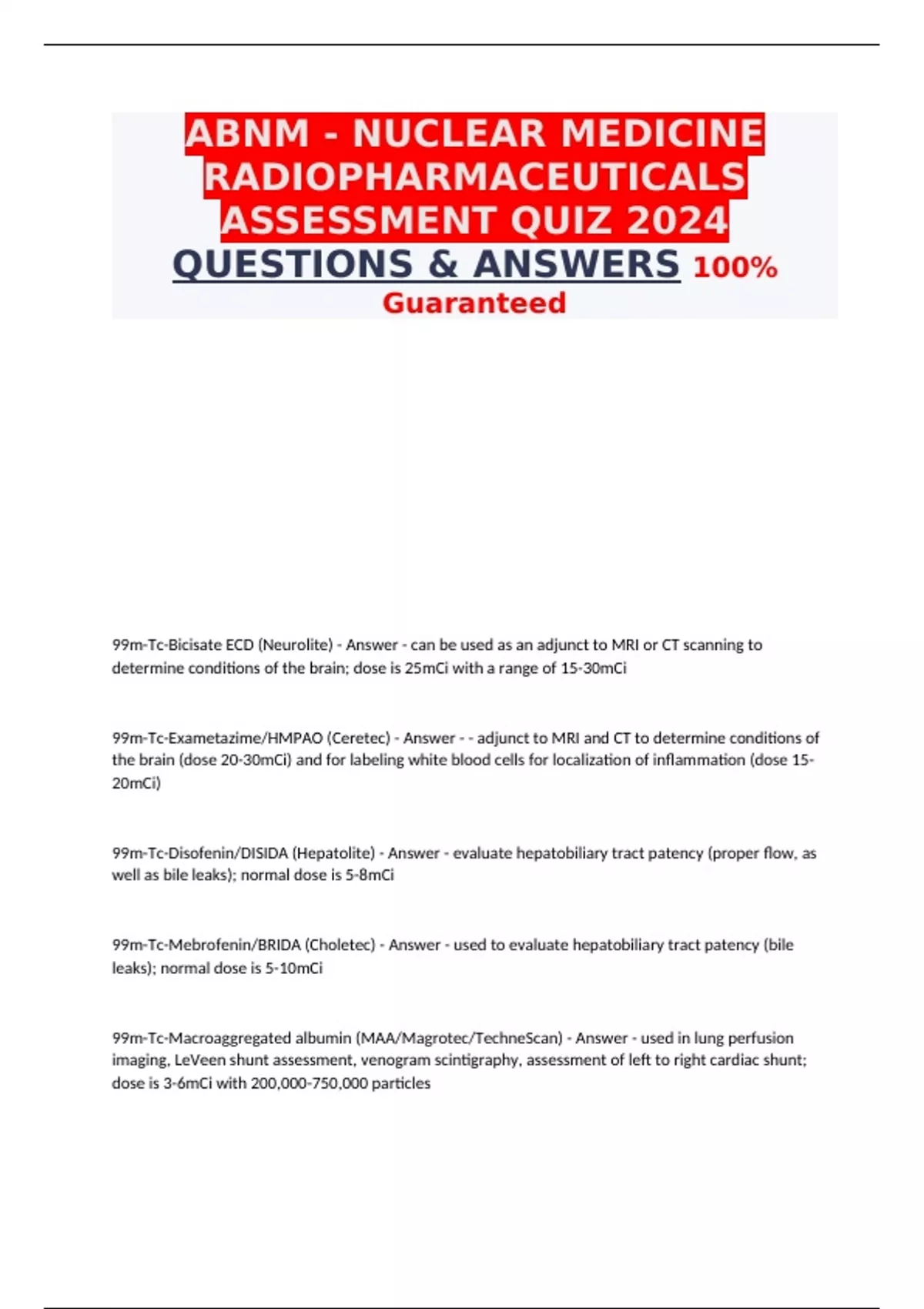 ABNM - NUCLEAR MEDICINE RADIOPHARMACEUTICALS ASSESSMENT QUIZ 2024 QUESTIONS & ANSWERS 100% Guaranteed