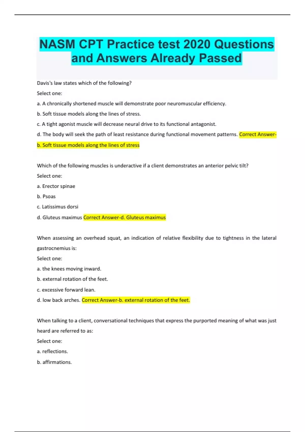 Davis's law states which of the following? Select one: a. A chronically shortened muscle will demonstrate poor neuromuscular efficiency. b. Soft tissue models along the lines of stress. c. A tight agonist muscle will decrease neural drive to its functional antagonist. d. The body will seek the path of least resistance during functional movement patterns. Correct Answerb. Soft tissue models along the lines of stress Which of the following muscles is underactive if a client demonstrates an anterior pelvic tilt? Select one: a. Erector spinae b. Psoas c. Latissimus dorsi d. Gluteus maximus Correct Answer-d. Gluteus maximus When assessing an overhead squat, an indication of relative flexibility due to tightness in the lateral gastrocnemius is: Select one: a. the knees moving inward. b. external rotation of the feet. c. excessive forward lean. d. low back arches. Correct Answer-b. external rotation of the feet. When talking to a client, conversational techniques that express the purported meaning of what was just heard are referred to as: Select one: a. reflections. b. affirmations.