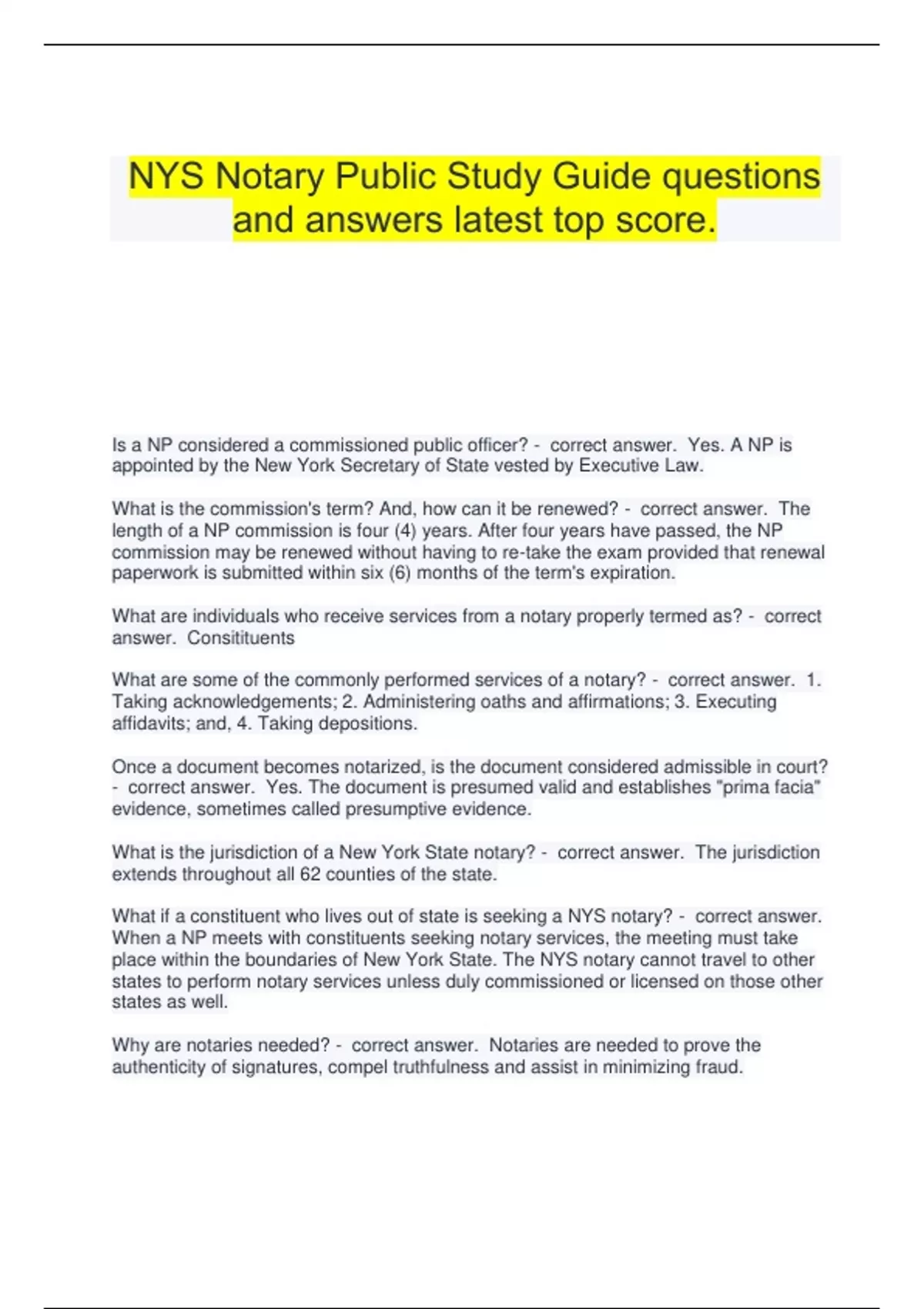 NYS Notary Public Study Guide questions and answers latest top score. Is a NP considered a commissioned public officer? - correct answer. Yes. A NP is appointed by the New York Secretary of State vested by Executive Law. What is the commission's term? And, how can it be renewed? - correct answer. The length of a NP commission is four (4) years. After four years have passed, the NP commission may be renewed without having to re-take the exam provided that renewal paperwork is submitted within six (6) months of the term's expiration. What are individuals who receive services from a notary properly termed as? - correct answer. Consitituents What are some of the commonly performed services of a notary? - correct answer. 1. Taking acknowledgements; 2. Administering oaths and affirmations; 3. Executing affidavits; and, 4. Taking depositions. Once a document becomes notarized, is the document considered admissible in court? - correct answer. Yes. The document is presumed valid and establishes "prima facia" evidence, sometimes called presumptive evidence. What is the jurisdiction of a New York State notary? - correct answer. The jurisdiction extends throughout all 62 counties of the state. What if a constituent who lives out of state is seeking a NYS notary? - correct answer. When a NP meets with constituents seeking notary services, the meeting must take place within the boundaries of New York State. The NYS notary cannot travel to other states to perform notary services unless duly commissioned or licensed on those other states as well. Why are notaries needed? - correct answer. Notaries are needed to prove the authenticity of signatures, compel truthfulness and assist in minimizing fraud.