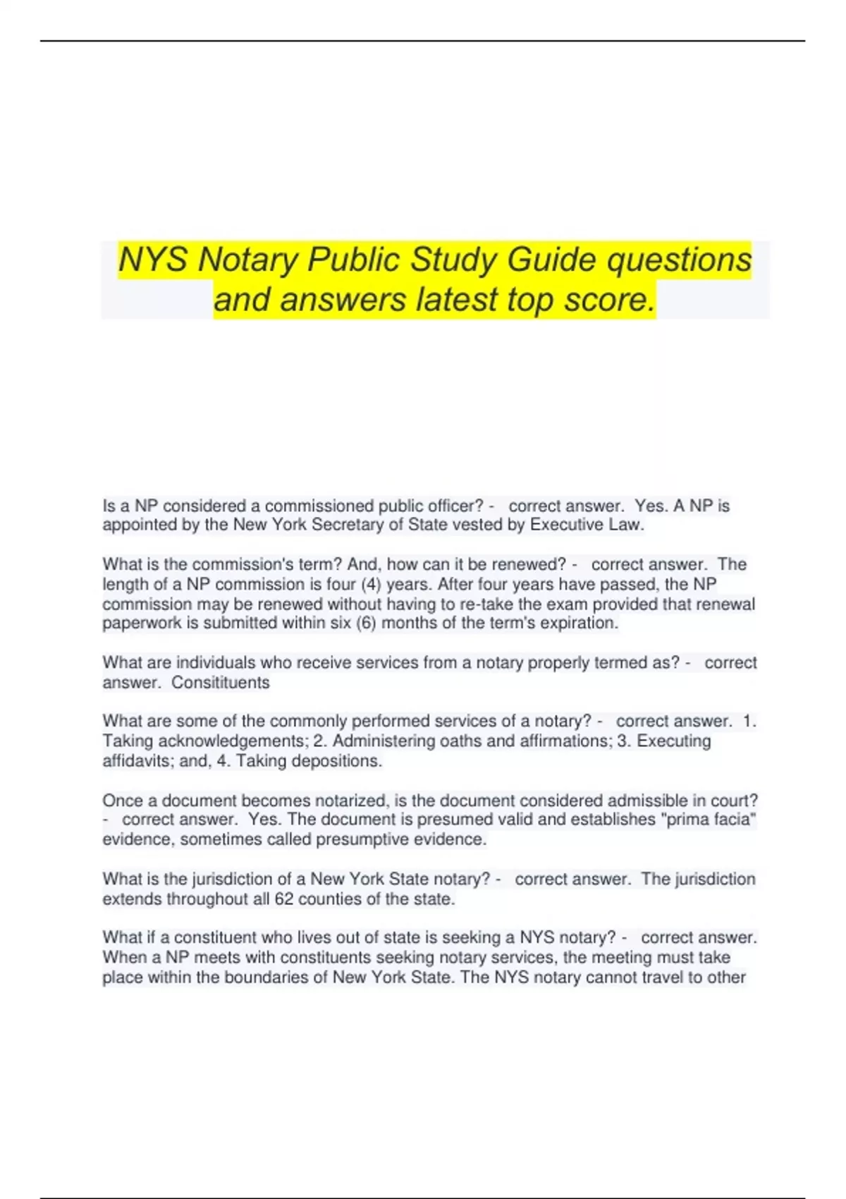 NYS Notary Public Study Guide questions and answers latest top score. Is a NP considered a commissioned public officer? - correct answer. Yes. A NP is appointed by the New York Secretary of State vested by Executive Law. What is the commission's term? And, how can it be renewed? - correct answer. The length of a NP commission is four (4) years. After four years have passed, the NP commission may be renewed without having to re-take the exam provided that renewal paperwork is submitted within six (6) months of the term's expiration. What are individuals who receive services from a notary properly termed as? - correct answer. Consitituents What are some of the commonly performed services of a notary? - correct answer. 1. Taking acknowledgements; 2. Administering oaths and affirmations; 3. Executing affidavits; and, 4. Taking depositions. Once a document becomes notarized, is the document considered admissible in court? - correct answer. Yes. The document is presumed valid and establishes "prima facia" evidence, sometimes called presumptive evidence. What is the jurisdiction of a New York State notary? - correct answer. The jurisdiction extends throughout all 62 counties of the state. What if a constituent who lives out of state is seeking a NYS notary? - correct answer. When a NP meets with constituents seeking notary services, the meeting must take place within the boundaries of New York State. The NYS notary cannot travel to other