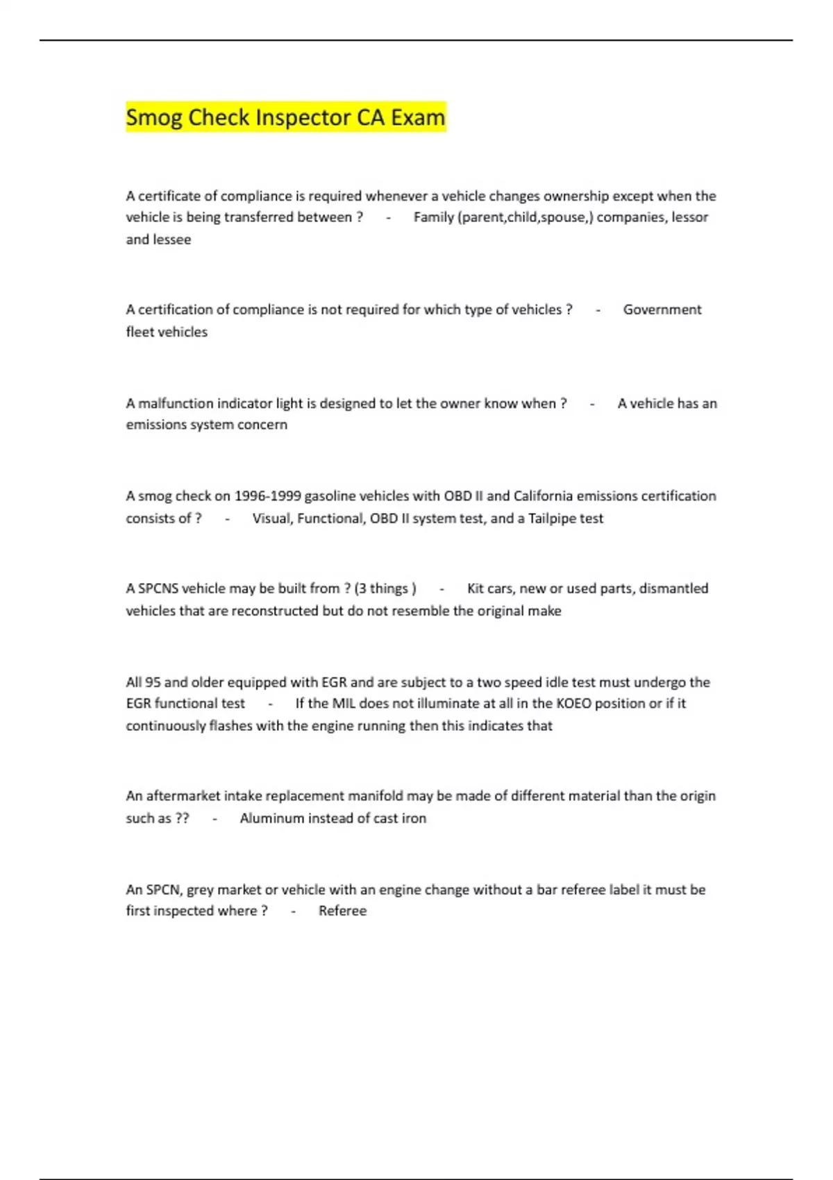 Smog Check Inspector CA Exam With The Most Correct Answers (verified)