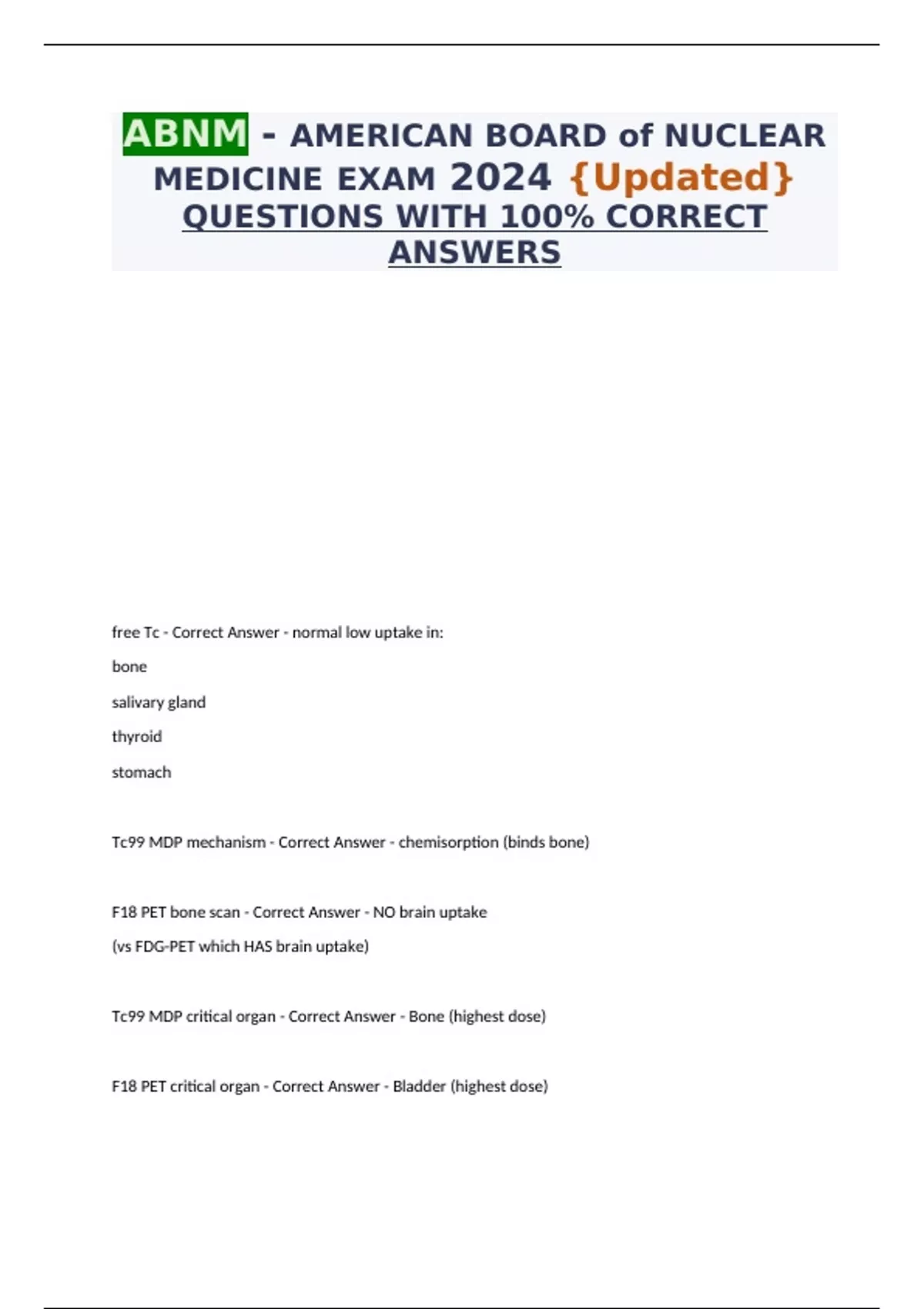 ABNM - AMERICAN BOARD of NUCLEAR MEDICINE EXAM 2024 {Updated} QUESTIONS WITH 100% CORRECT ANSWERS