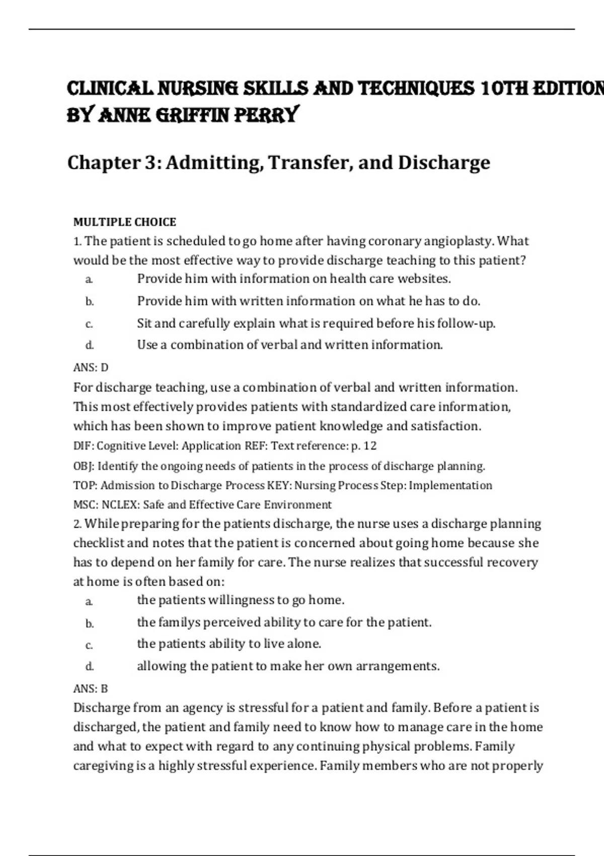 TEST BANK CLINICAL NURSING SKILLS AND TECHNIQUES, 10TH EDITION BY ANNE GRIFFIN PERRY ISBN- 978-0323708630 Unit 3. Admitting, transfer, and discharge Verified 2024 Practice Questions and 100% Correct Answers with Explanations for Exam Preparation, Graded A+ MULTIPLE CHOICE 1. The patient is scheduled to go home after having coronary angioplasty. What would be the most effective way to provide discharge teaching to this patient? a. Provide him with information on health care websites. b. Provide him with written information on what he has to do. c. Sit and carefully explain what is required before his follow-up. d. Use a combination of verbal and written information. ANS: D For discharge teaching, use a combination of verbal and written information. This most effectively provides patients with standardized care information, which has been shown to improve patient knowledge and satisfaction. DIF: Cognitive Level: Application REF: Text reference: p. 12 OBJ: Identify the ongoing needs of patients in the process of discharge planning. TOP: Admission to Discharge Process KEY: Nursing Process Step: Implementation MSC: NCLEX: Safe and Effective Care Environment 2. While preparing for the patients discharge, the nurse uses a discharge planning checklist and notes that the patient is concerned about going home because she has to depend on her family for care. The nurse realizes that successful recovery at home is often based on: a. the patients willingness to go home. b. the familys perceived ability to care for the patient. c. the patients ability to live alone. d. allowing the patient to make her own arrangements. ANS: B Discharge from an agency is stressful for a patient and family. Before a patient is discharged, the patient and family need to know how to manage care in the home and what to expect with regard to any continuing physical problems. Family caregiving is a highly stressful experience. Family members who are not properly prepared for caregiving are frequently overwhelmed by patient needs, which can lead to unnecessary hospital readmissions. DIF: Cognitive Level: Analysis REF: Text reference: p. 22 OBJ: Identify the ongoing needs of patients in the process of discharge planning. TOP: Medication Reconciliation KEY: Nursing Process Step: Assessment MSC: NCLEX: Psychosocial Integrity