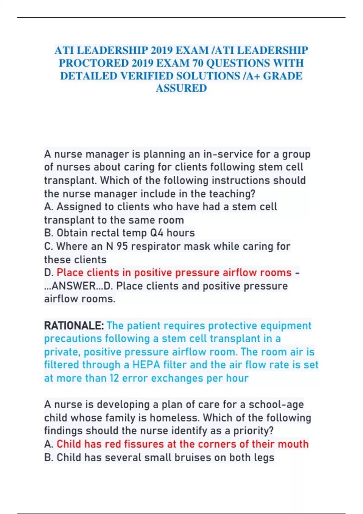 ATI LEADERSHIP 2019 EXAM /ATI LEADERSHIP PROCTORED 2019 EXAM 70 QUESTIONS WITH DETAILED VERIFIED SOLUTIONS /A+ GRADE ASSURED