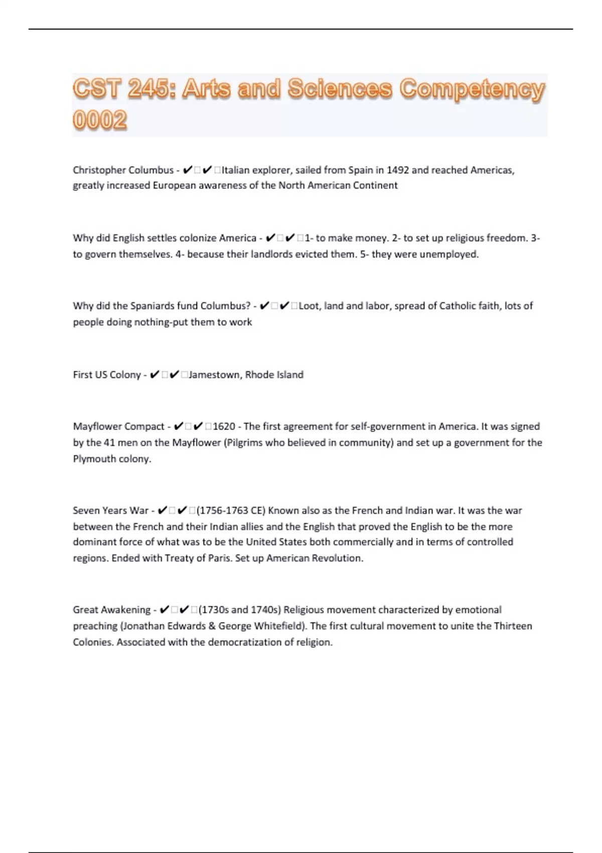 Christopher Columbus - ️️Italian explorer, sailed from Spain in 1492 and reached Americas, greatly increased European awareness of the North American Continent Why did English settles colonize America - ️️1- to make money. 2- to set up religious freedom. 3- to govern themselves. 4- because their landlords evicted them. 5- they were unemployed. Why did the Spaniards fund Columbus? - ️️Loot, land and labor, spread of Catholic faith, lots of people doing nothing-put them to work First US Colony - ️️Jamestown, Rhode Island Mayflower Compact - ️️1620 - The first agreement for self-government in America. It was signed by the 41 men on the Mayflower (Pilgrims who believed in community) and set up a government for the Plymouth colony. Seven Years War - ️️( CE) Known also as the French and Indian war. It was the war between the French and their Indian allies and the English that proved the English to be the more dominant force of what was to be the United States both commercially and in terms of controlled regions. Ended with Treaty of Paris. Set up American Revolution. Great Awakening - ️️(1730s and 1740s) Religious movement characterized by emotional preaching (Jonathan Edwards & George Whitefield). The first cultural movement to unite the Thirteen Colonies. Associated with the democratization of religion.