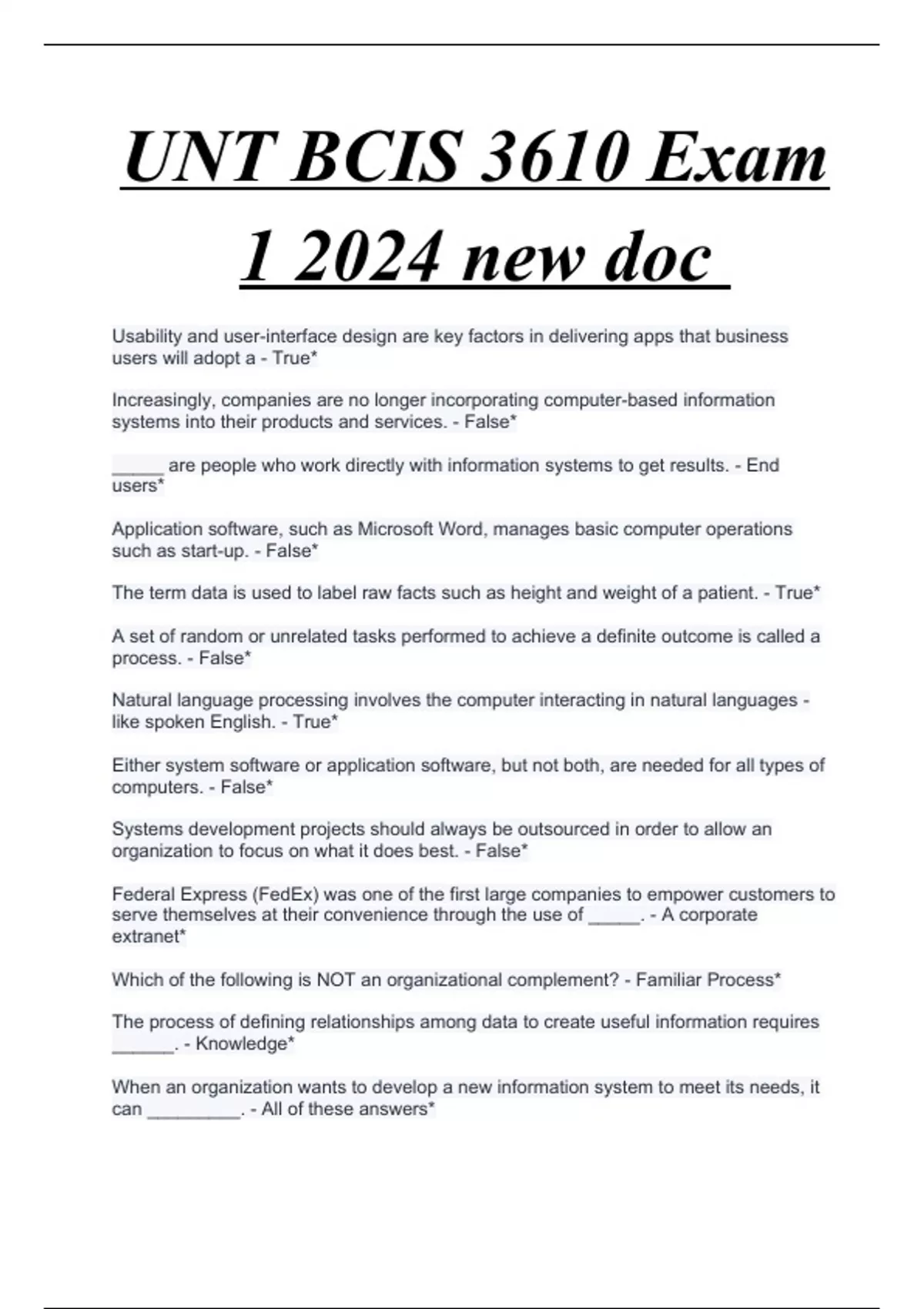 UNT BCIS 3610 Exam 1 2024 new doc Usability and user-interface design are key factors in delivering apps that business users will adopt a - True* Increasingly, companies are no longer incorporating computer-based information systems into their products and services. - False* _____ are people who work directly with information systems to get results. - End users*