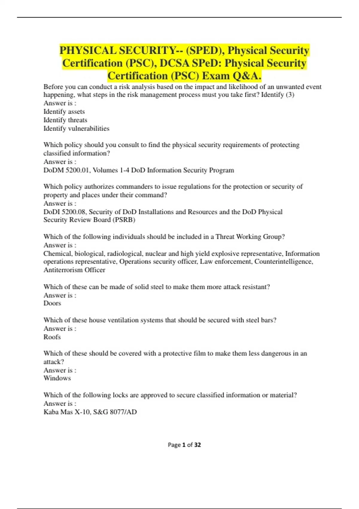Before you can conduct a risk analysis based on the impact and likelihood of an unwanted event happening, what steps in the risk management process must you take first? Identify (3) Answer is : Identify assets Identify threats Identify vulnerabilities Which policy should you consult to find the physical security requirements of protecting classified information? Answer is : DoDM 5200.01, Volumes 1-4 DoD Information Security Program Which policy authorizes commanders to issue regulations for the protection or security of property and places under their command? Answer is : DoDI 5200.08, Security of DoD Installations and Resources and the DoD Physical Security Review Board (PSRB) Which of the following individuals should be included in a Threat Working Group? Answer is : Chemical, biological, radiological, nuclear and high yield explosive representative, Information operations representative, Operations security officer, Law enforcement, Counterintelligence, Antiterrorism Officer Which of these can be made of solid steel to make them more attack resistant? Answer is : Doors Which of these house ventilation systems that should be secured with steel bars? Answer is : Roofs Which of these should be covered with a protective film to make them less dangerous in an attack? Answer is : Windows Which of the following locks are approved to secure classified information or material? Answer is : Kaba Mas X-10, S&G 8077/AD