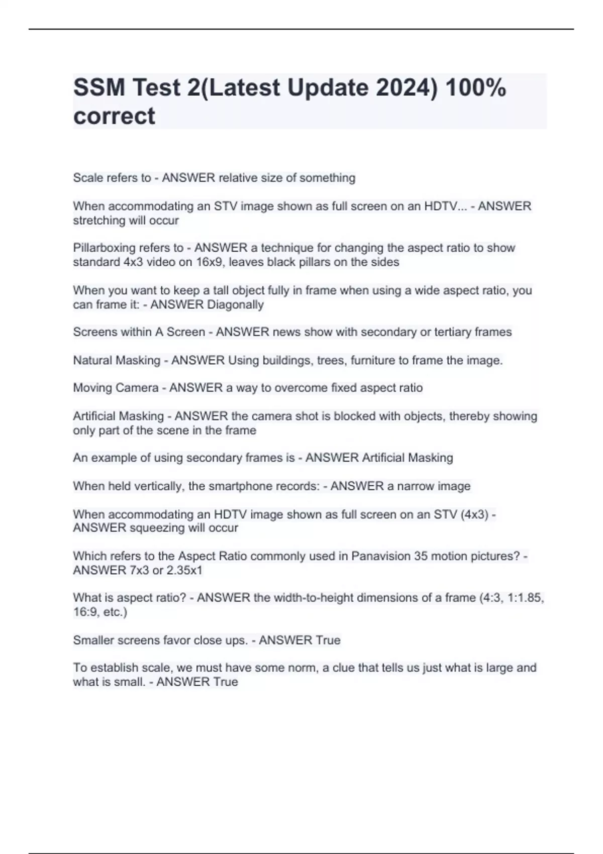 SSM Test 2(Latest Update 2024) 100% correScale refers to - ANSWER relative size of something When accommodating an STV image shown as full screen on an HDTV... - ANSWER stretching will occur Pillarboxing refers to - ANSWER a technique for changing the aspect ratio to show standard 4x3 video on 16x9, leaves black pillars on the sides When you want to keep a tall object fully in frame when using a wide aspect ratio, you can frame it: - ANSWER Diagonally Screens within A Screen - ANSWER news show with secondary or tertiary frames Natural Masking - ANSWER Using buildings, trees, furniture to frame the image. Moving Camera - ANSWER a way to overcome fixed aspect ratio Artificial Masking - ANSWER the camera shot is blocked with objects, thereby showing only part of the scene in the frame An example of using secondary frames is - ANSWER Artificial Masking When held vertically, the smartphone records: - ANSWER a narrow image When accommodating an HDTV image shown as full screen on an STV (4x3) - ANSWER squeezing will occur Which refers to the Aspect Ratio commonly used in Panavision 35 motion pictures? - ANSWER 7x3 or 2.35x1 What is aspect ratio? - ANSWER the width-to-height dimensions of a frame (4:3, 1:1.85, 16:9, etc.) Smaller screens favor close ups. - ANSWER True To establish scale, we must have some norm, a clue that tells us just what is large and what is small. - ANSWER True Windowboxing refers to: - ANSWER Placing a smaller picture in the center of the actual display screen, with the leftover space surrounding it. Letterboxing refers to: - ANSWER a technique for changing the aspect ratio to show wide-screen material on the standard 4 x 3 video screen by leaving black borders called dead zones at the top and bottom of the screen. Which aspect ratio has the widest horizontal stretch? - ANSWER 2.39 x 1 With standard aspect ratio, you can establish a scene without having to go to an extreme long shot. - ANSWER False A sct