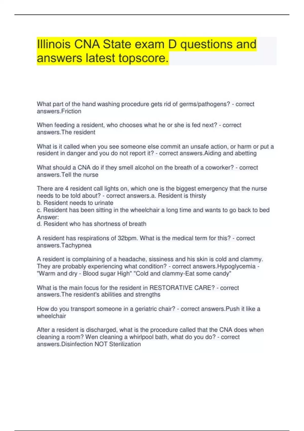 Illinois CNA State exam D questions and answers latest topscore.
