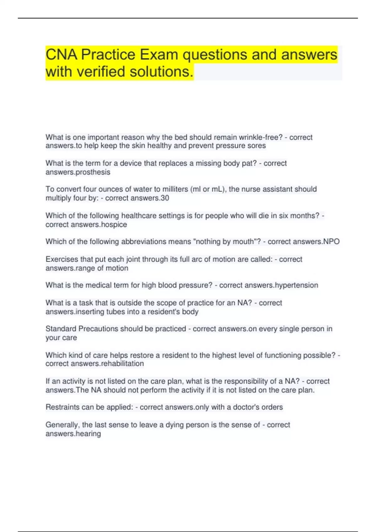CNA Practice Exam questions and answers with verified solutions. What is one important reason why the bed should remain wrinkle-free? - correct help keep the skin healthy and prevent pressure sores What is the term for a device that replaces a missing body pat? - correct hesis To convert four ounces of water to milliters (ml or mL), the nurse assistant should multiply four by: - correct answers.30 Which of the following healthcare settings is for people who will die in six months? - correct ce Which of the following abbreviations means "nothing by mouth"? - correct answers.NPO Exercises that put each joint through its full arc of motion are called: - correct of motion What is the medical term for high blood pressure? - correct tension What is a task that is outside the scope of practice for an NA? - correct ting tubes into a resident's body Standard Precautions should be practiced - correct every single person in your care Which kind of care helps restore a resident to the highest level of functioning possible? - correct ilitation If an activity is not listed on the care plan, what is the responsibility of a NA? - correct answers.The NA should not perform the activity if it is not listed on the care plan. Restraints can be applied: - correct with a doctor's orders Generally, the last sense to leave a dying person is the sense of - correct ng What is a normal range of a blood pressure? - correct s 119/75 is an example Incontinence may be caused by: - correct us system diseases Standing with the legs shoulder-width apart is using - correct body mechanics Aftr an amputation, a resident may experience phantom sensation. Phantom sensation is - correct or sensation caused by remaining nerve endings How should a fracture pan be positioned? - correct the handle toward the foot of the bed What does palliative care involve? - correct relief and comfort Nursing assistants do not usually perform procedures that require - correct le technique Insulin reaction can be caused by - correct little food Which of the following is a requirement of OBRA? - correct ng assistants must have at least 75 hours of training What is a good way for a nursing assistant to care for a mentally ill resident? - correct rt the resident and his or her family and friends When should sheets be changed? - correct ver they are soiled, wrinkled, or damp What does the chain of command do? - correct ibes the line of authority What is a good way for a nursing assistant to respond to inappropriate sexual behavior? - correct the resident to a private area What should a nursing assistant do if she suspects a resident is being abused? - correct should report it to the nurse immediately and let him/her handle it from there What is one good way a nursing assistant can assist residents with normal changes of aging related to the urinary system? - correct frequent trips to the bathroom Which of the following is true of Transmission-Based Precautions? - correct are practiced in addition to Standard Precautions