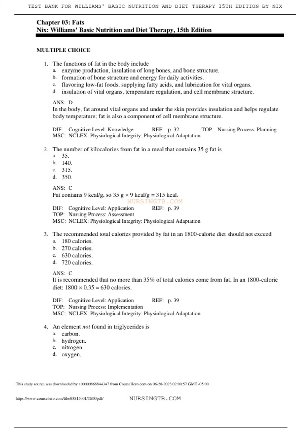 1. The functions of fat in the body include a. enzyme production, insulation of long bones, and bone structure. b. formation of bone structure and energy for daily activities. c. flavoring low-fat foods, supplying fatty acids, and lubrication for vital organs. d. insulation of vital organs, temperature regulation, and cell membrane structure. ANS: D In the body, fat around vital organs and under the skin provides insulation and helps regulate body temperature; fat is also a component of cell membrane structure. DIF: Cognitive Level: Knowledge REF: p. 32 MSC: NCLEX: Physiological Integrity: Physiological Adaptation TOP: Nursing Process: Planning 2. The number of kilocalories from fat in a meal that contains 35 g fat is a. 35. b. 140. c. 315. d. 350. ANS: C Fat contains 9 kcal/g, so 35 g 9 kcal/g = 315 kcal. N U R S I N G T B . C O M DIF: Cognitive Level: Application TOP: Nursing Process: Assessment REF: p. 39 MSC: NCLEX: Physiological Integrity: Physiological Adaptation 3. The recommended total calories provided by fat in an 1800-calorie diet should not exceed a. 180 calories. b. 270 calories. c. 630 calories. d. 720 calories. ANS: C It is recommended that no more than 35% of total calories come from fat. In an 1800-calorie diet: 1800 0.35 = 630 calories. DIF: Cognitive Level: Application TOP: Nursing Process: Implementation REF: p. 39 MSC: NCLEX: Physiological Integrity: Physiological Adaptation 4. An element not found in triglycerides is a. carbon. b. hydrogen. c. nitrogen. d. oxygen
