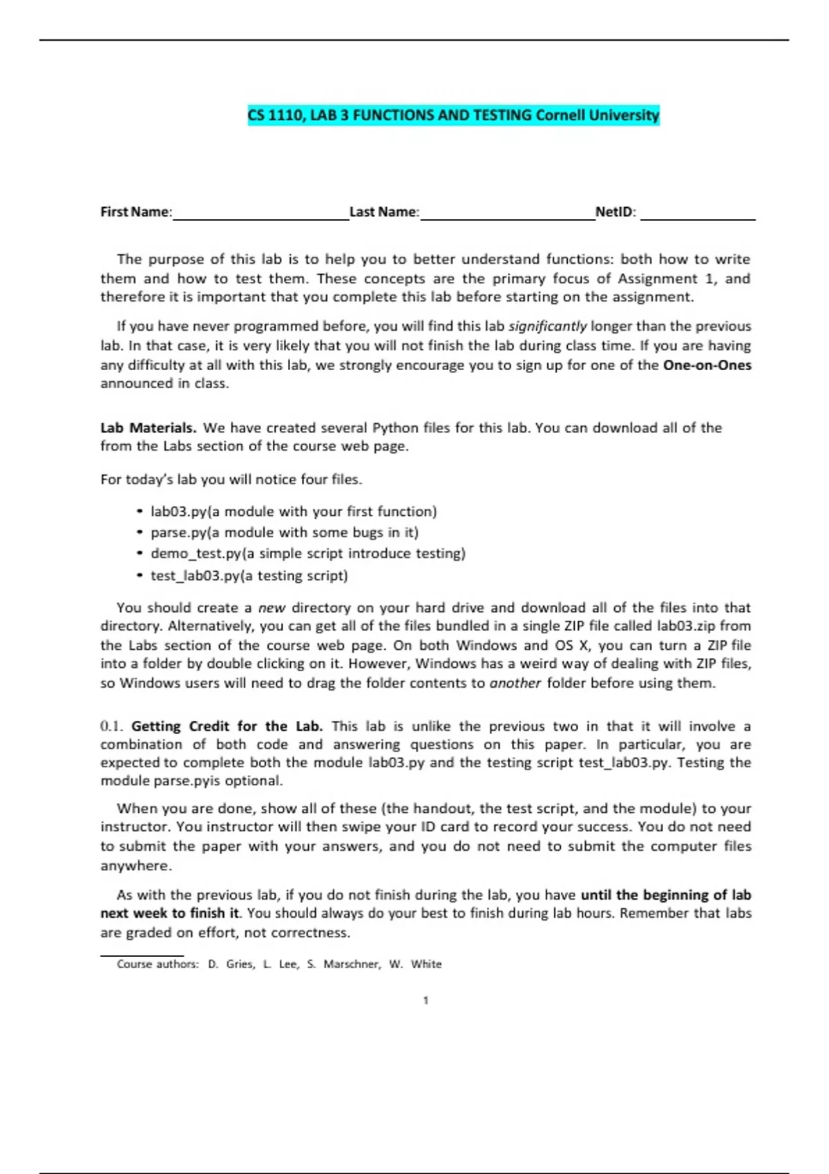 CS 1110, LAB 3 FUNCTIONS AND TESTING Cornell University