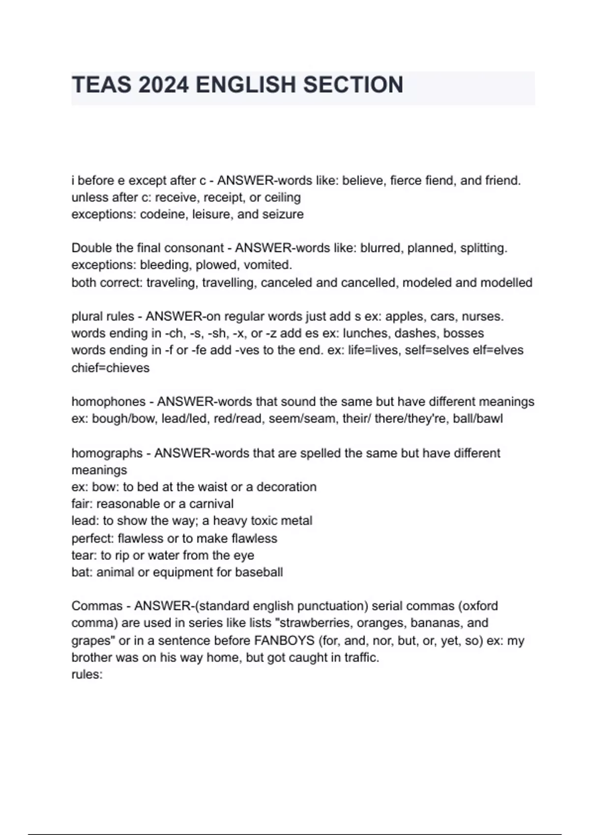 i before e except after c - ANSWER-words like: believe, fierce fiend, and friend. unless after c: receive, receipt, or ceiling exceptions: codeine, leisure, and seizure Double the final consonant - ANSWER-words like: blurred, planned, splitting. exceptions: bleeding, plowed, vomited. both correct: traveling, travelling, canceled and cancelled, modeled and modelled plural rules - ANSWER-on regular words just add s ex: apples, cars, nurses. words ending in -ch, -s, -sh, -x, or -z add es ex: lunches, dashes, bosses words ending in -f or -fe add -ves to the end. ex: life=lives, self=selves elf=elves chief=chieves homophones - ANSWER-words that sound the same but have different meanings ex: bough/bow, lead/led, red/read, seem/seam, their/ there/they're, ball/bawl homographs - ANSWER-words that are spelled the same but have different meanings ex: bow: to bed at the waist or a decoration fair: reasonable or a carnival lead: to show the way; a heavy toxic metal perfect: flawless or to make flawless tear: to rip or water from the eye bat: animal or equipment for baseball Commas - ANSWER-(standard english punctuation) serial commas (oxford comma) are used in series like lists "strawberries, oranges, bananas, and grapes" or in a sentence before FANBOYS (for, and, nor, but, or, yet, so) ex: my brother was on his way home, but g