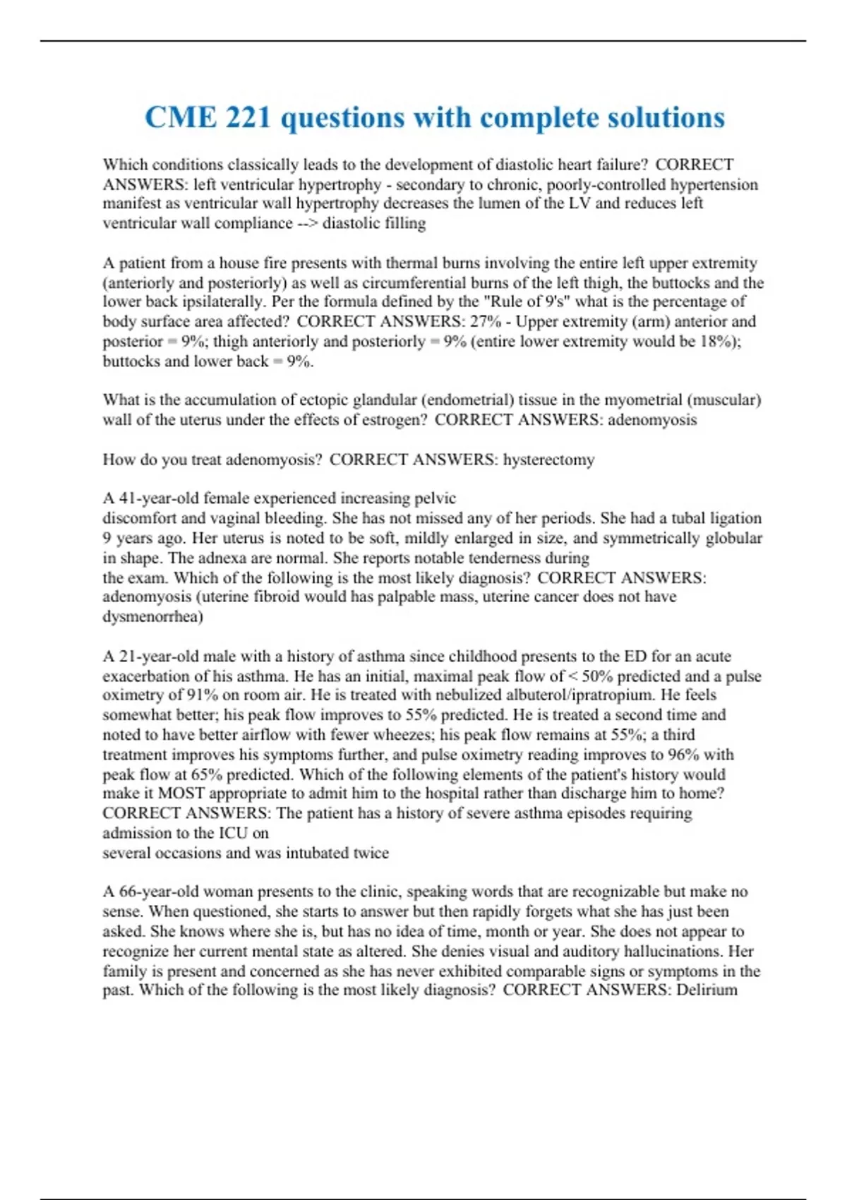 CME 221 questions with complete solutions Which conditions classically leads to the development of diastolic heart failure? CORRECT ANSWERS: left ventricular hypertrophy - secondary to chronic, poorly-controlled hypertension manifest as ventricular wall hypertrophy decreases the lumen of the LV and reduces left ventricular wall compliance --> diastolic filling