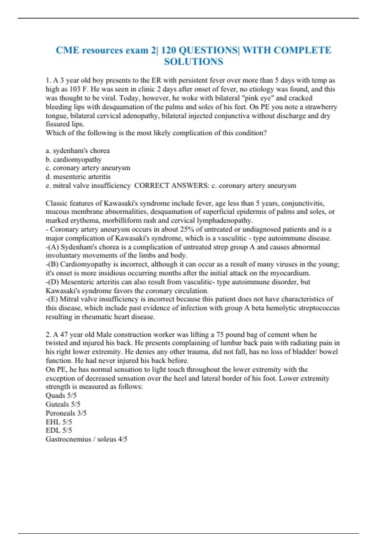 CME resources exam 2| 120 QUESTIONS| WITH COMPLETE SOLUTIONS 1. A 3 year old boy presents to the ER with persistent fever over more than 5 days with temp as high as 103 F. He was seen in clinic 2 days after onset of fever, no etiology was found, and this was thought to be viral. Today, however, he woke with bilateral "pink eye" and cracked bleeding lips with desquamation of the palms and soles of his feet. On PE you note a strawberry tongue, bilateral cervical adenopathy, bilateral injected conjunctiva without discharge and dry fissured lips. Which of the following is the most likely complication of this condition?