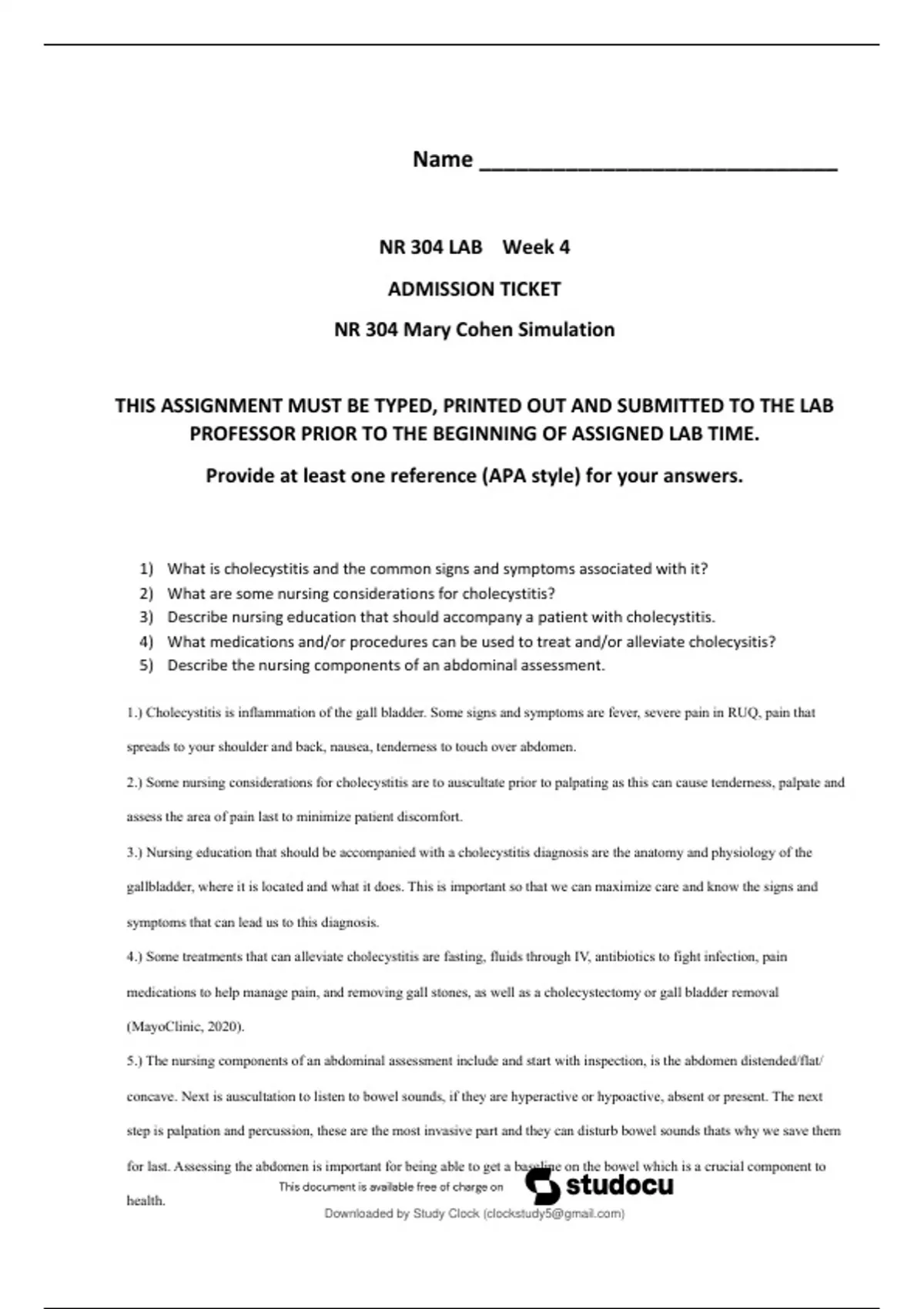 NR304 LAB Week4 ADMISSION TICKE T - Mary Cohen Simulation THIS ASSIGNMENT MUST BE TYPED, PRINTED OUT AND SUBMITTED TO THE LAB PROFESSOR PRIOR TO THE BEGINNING OF ASSIGNED LAB TIME. Provide at least one reference (APA style) for your answers. 1) What is cholecystitis and the common signs and symptoms associated with it? 2) What are some nursing considerations for cholecystitis? 3) Describe nursing education that should accom