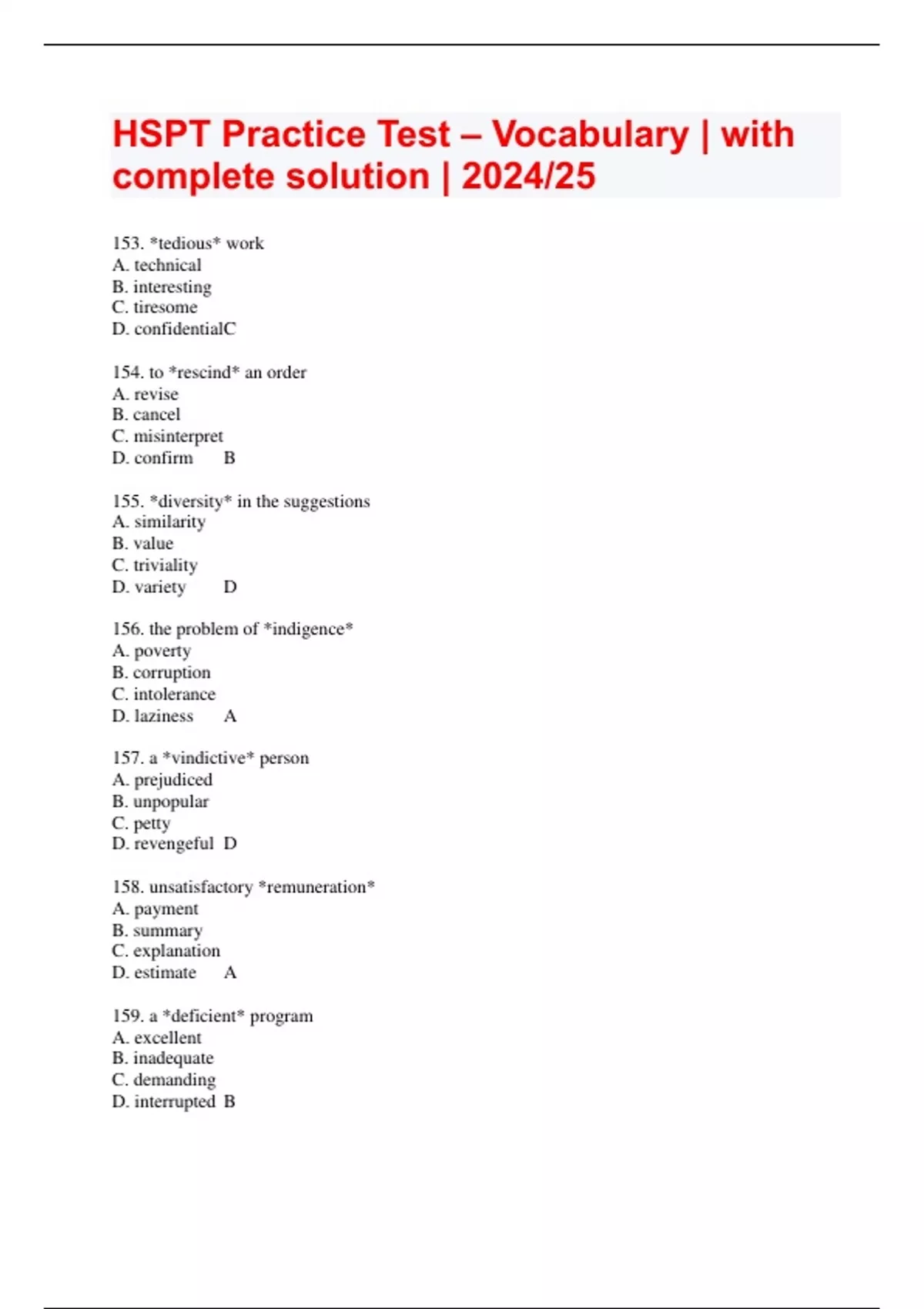 HSPT Practice Test – Vocabulary | with complete solution | 2024/25