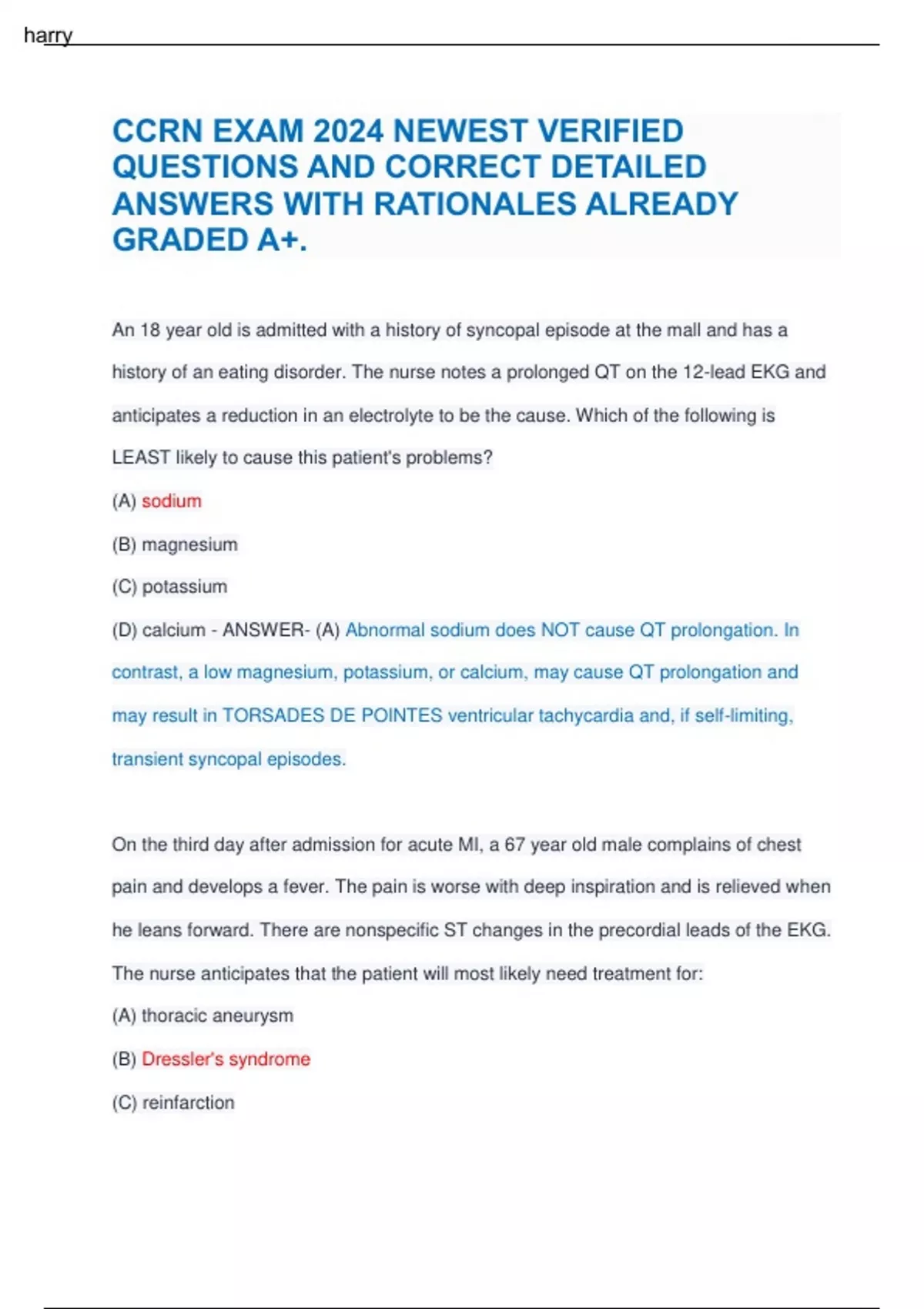 ADVANCED PATHOPHYSIOLOGY EXAMS WITH ACTUAL CORRECT QUESTIONS AND VERIFIED DETAILED RATIONALES ANSWERS LATEST 2024 (NEWEST) ALREADY GRADED A+ CCRN EXAM 2024 NEWEST VERIFIED QUESTIONS AND CORRECT DETAILED ANSWERS WITH RATIONALES ALREADY GRADED A+. An 18 year old is admitted with a history of syncopal episode at the mall and has a history of an eating disorder. The nurse notes a prolonged QT on the 12-lead EKG and anticipates a reduction in an electrolyte to be the cause. Which of the following is LEAST likely to cause this patient's problems? (A) sodium (B) magnesium (C) potassium (D) calcium - ANSWER- (A) Abnormal sodium does NOT cause QT prolongation. In contrast, a low magnesium, potassium, or calcium, may cause QT prolongation and may result in TORSADES DE POINTES ventricular tachycardia and, if self-limiting, transient syncopal episodes. On the third day after admission for acute MI, a 67 year old male complains of chest pain and develops a fever. The pain is worse with deep inspiration and is relieved when he leans forward. There are nonspecific ST changes in the precordial leads of the EKG. The nurse anticipates that the patient will most likely need treatment for: (A) thoracic aneurysm (B) Dressler's syndrome (C) reinfarction harry (D) pleuritis - ANSWER- (B) The pain described in the scenario is typical of the pain caused by pericarditis. Dressler's syndrome is the pericarditis that may result after an acute MI. A patient is admitted to the CCU after a PCI with stent. Femoral sheath is in place, site is dry with no hematoma. He suddenly complains of severe back pain. Neck veins are flat with head of bed 30 degrees, heart sounds are normal. Vital signs are BP 78/48, HR 124 and RR 26. What should the nurse suspect? (A) cardiac tamponade (B) retroperitoneal bleeding (C) coronary artery dissection (D) acute closure of the stented coronary artery - ANSWER- (B) Retroperitoneal bleeding may cause signs of hypovolemia and hypovolemic shock as described in the scenario. It may be a complication of a PCI if the femoral artery is the access site during the procedure. Only this problem results in severe back pain; none of the other 3 choices results in back pain Your patient admitted with an NSTEMI develops acute shortness of breath, recurrence of chest pain, and a loud systolic murmur at the apex of the heart. Which of the following has most likely occurred? (A) the patient has developed acute mitral valve regurgitation (B) the patient has developed acute infarction (C) the patient has developed acute mitral wave stenosis