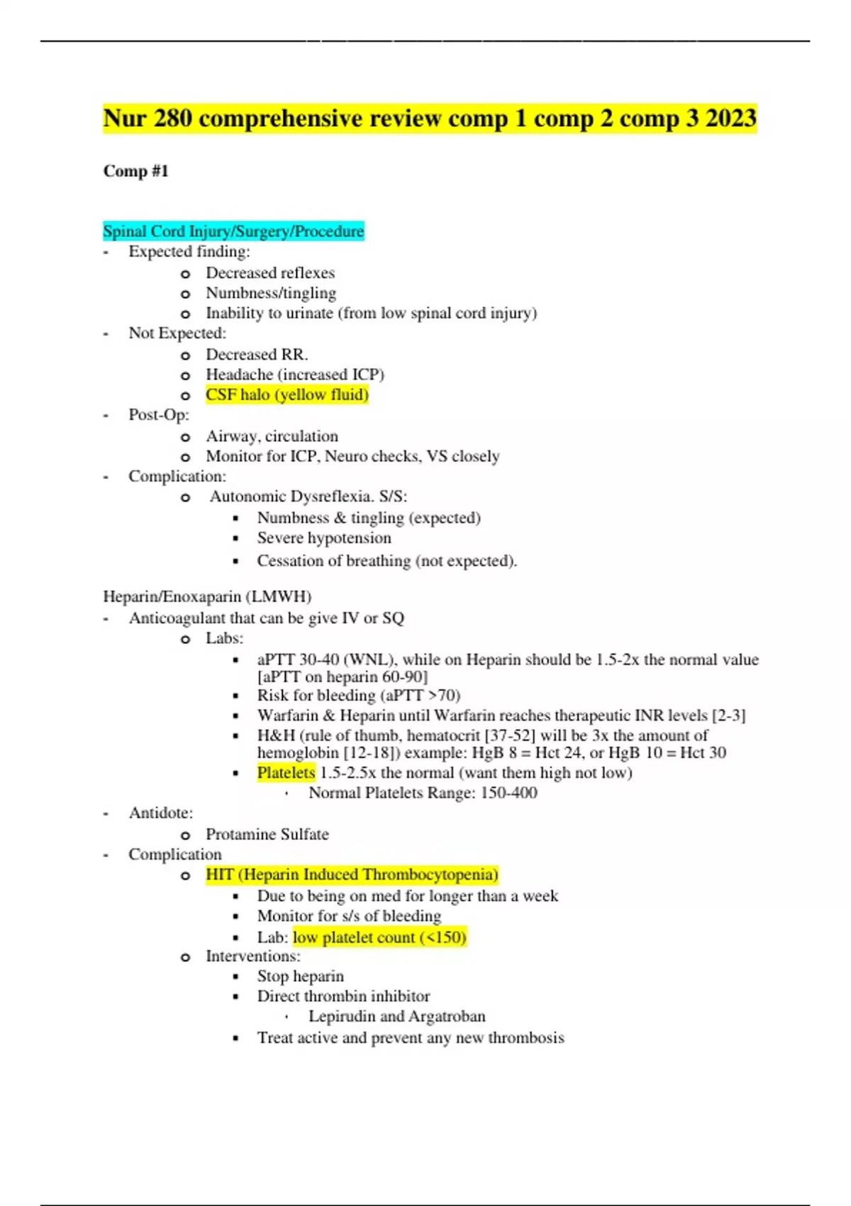Comp #1 Spinal Cord Injury/Surgery/Procedure - Expected finding: o Decreased reflexes o Numbness/tingling o Inability to urinate (from low spinal cord injury) - Not Expected: o Decreased RR. o Headache (increased ICP) o CSF halo (yellow fluid) - Post-Op: o Airway, circulation o Monitor for ICP, Neu...