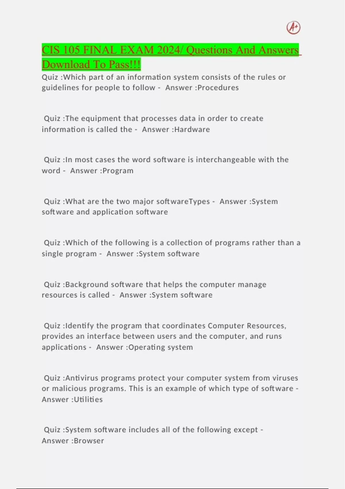 CIS 105 FINAL EXAM 2024/ Questions And Answers Download To Pass!!!