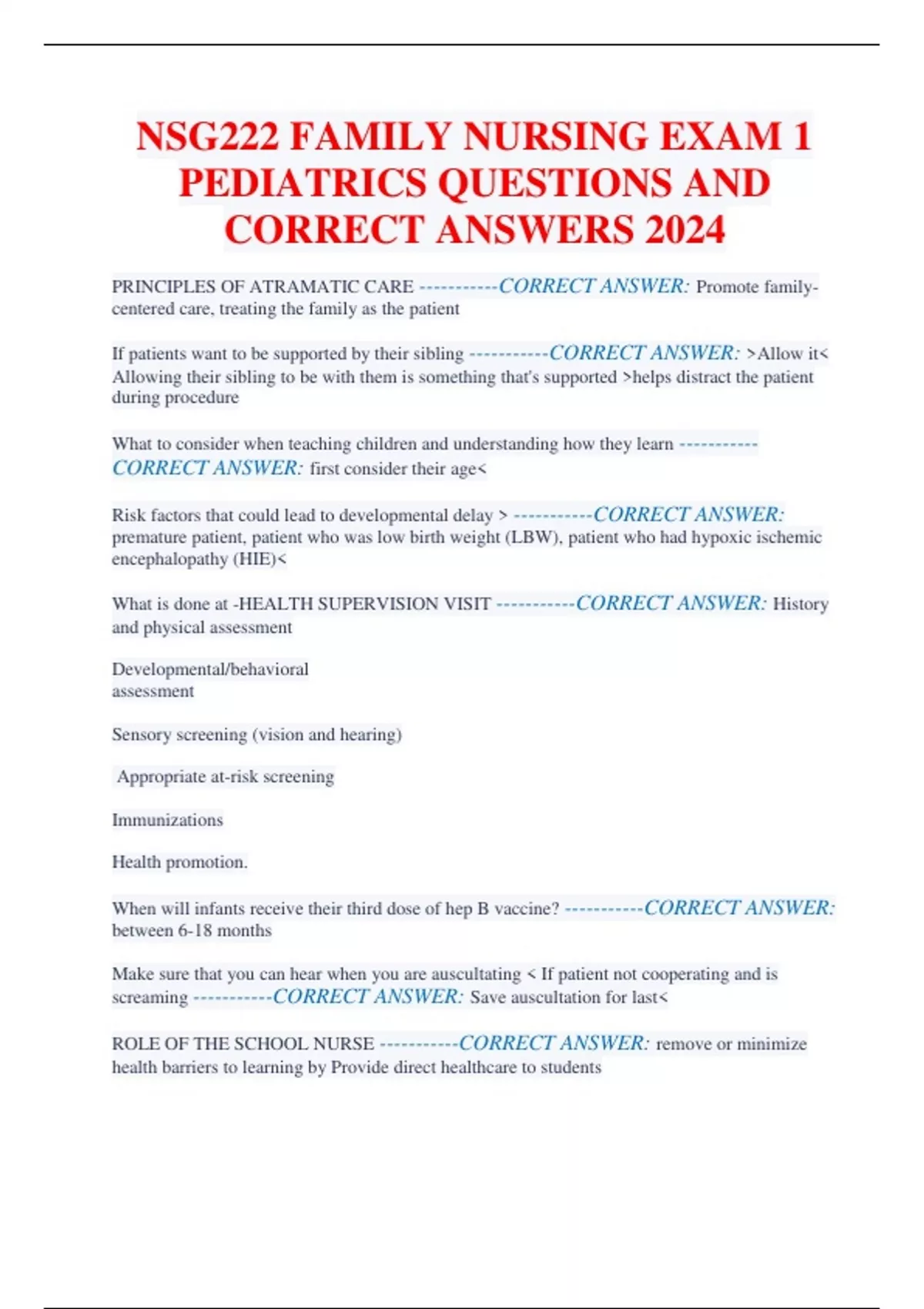 NSG222 FAMILY NURSING EXAM 1 PEDIATRICS QUESTIONS AND CORRECT ANSWERS 2024