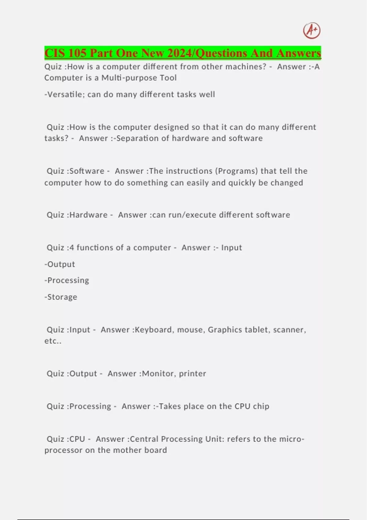 CIS 105 Part One New 2024/Questions And Answers